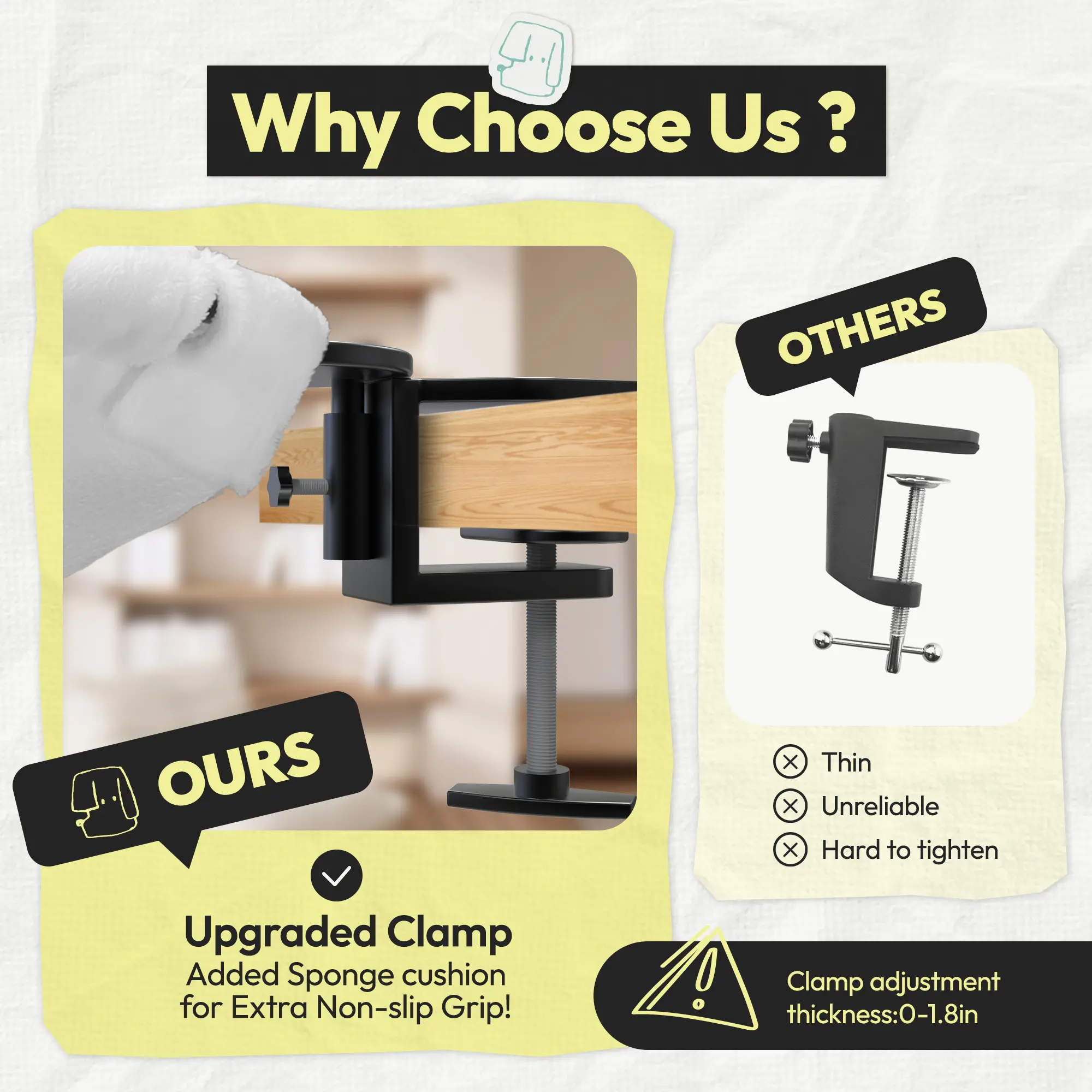The clamp wasn’t wide enough to clamp on the desk