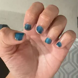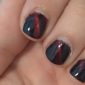 I'm obsessed with this color. it looks a bit darker irl in comparison to the thumbnail, but I knew that going in because I saw it sampled on the seller's Livestream. Ive been wearing this on my toes for about three weeks and it hasn't chipped or budged. about two weeks on my fingers and it's starting to chip now (I use my hands a lot, and I don't use gel extensions. I follow the whole process of correctly applying the polish with base and top coat etc) ignore my messy cuticles in the photos. these were taken today, after two weeks of wear. this was applied over black gel.