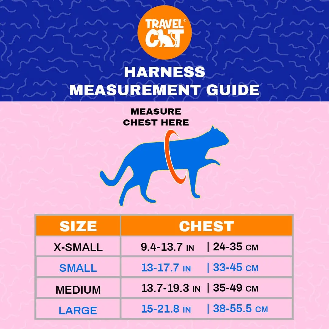 Confidently take your cat out walking, training, hiking and exploring the great outdoors with our adjustable, breathable harness and strong, harness and leash set. This harness has two ways to adjust, from its velcro fastener and plastic adjustable clip, you can make it comfy and have room to grow.