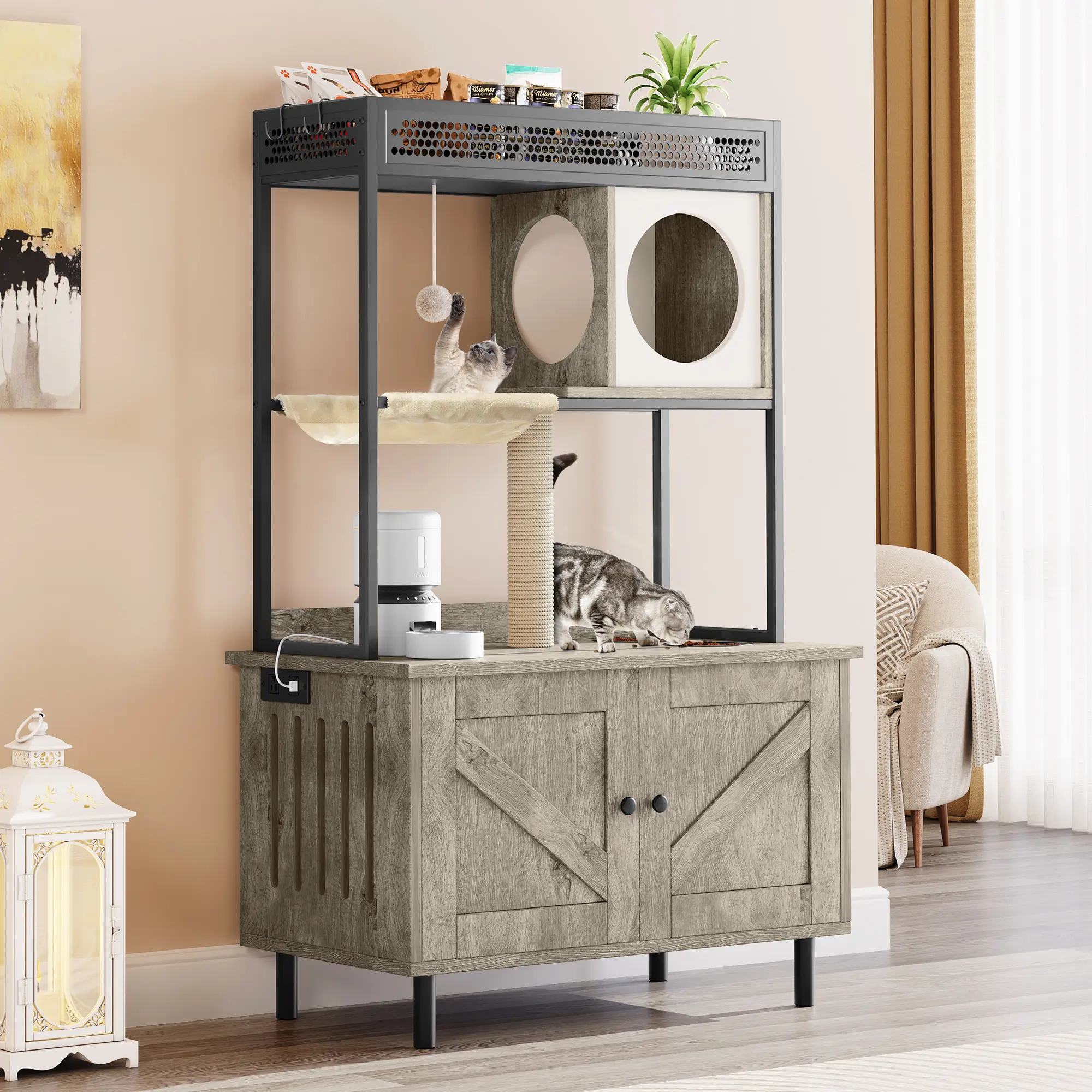 easiest assembly my cats love it. It’s grey, especially if you have like a small smaller room and needs stuff For storage