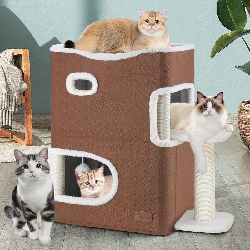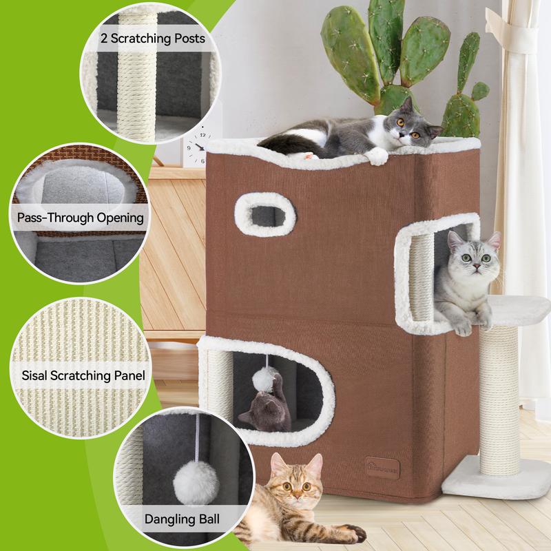 【Tri-Level Fun】: Our 2-storey cat house offers two spacious cat bed caves that allow your pets to snuggle, and the upper platform functions as a perch for resting or a fort to survey surroundings; The pass-through hole facilitates unrestricted play between tiers.