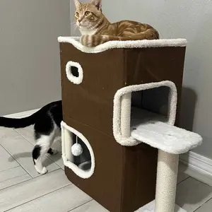 【Interactive Small Cat Tower】: Create a fun and engaging space for your cats with this cat condo; The hanging plush ball on the lower level provides extra entertainment and interactivity for your furry friends.