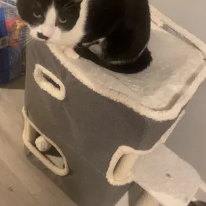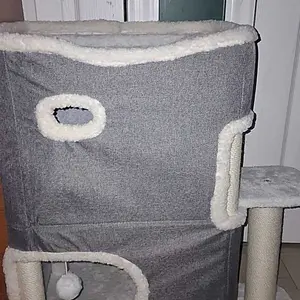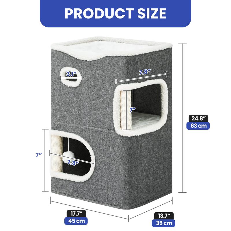 【Versatile Applications】: This cat condo has a large cat scratching board and two scratching posts so that multiple cats can keep their nails healthy at the same time; Also features a hanging plush ball at the hole on the 1st level to attract cats' attention and provide immense entertainment and interaction