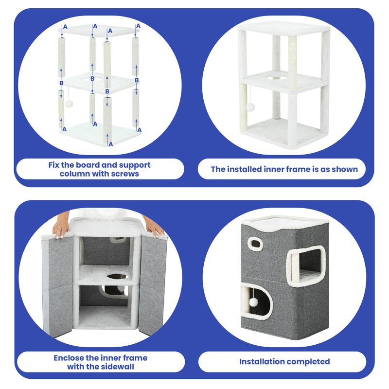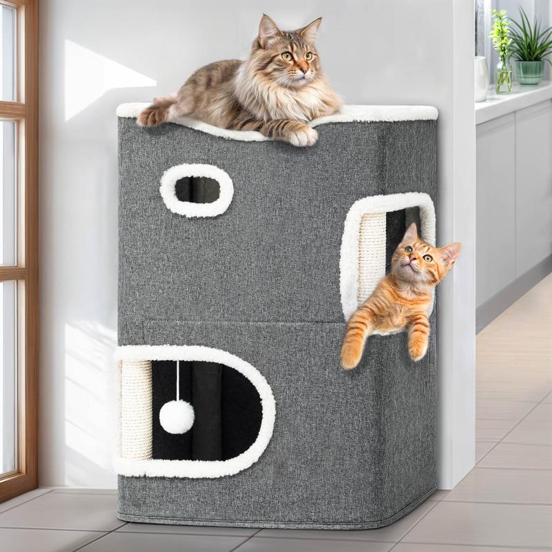 【2-Level Cat House Cube】: This cat house provides three areas for cats to rest and frolic; Both the first and second floors have an 8-inch entry hole for easy access, and there is a small hole in the middle of the two floors for cats to travel up and down for endless fun; The 3rd floor grants an open space for cats to relax and play