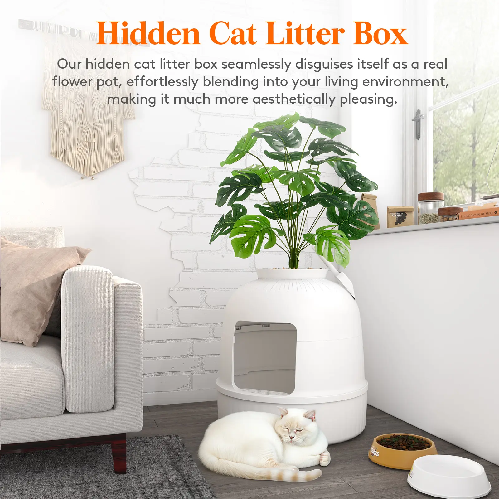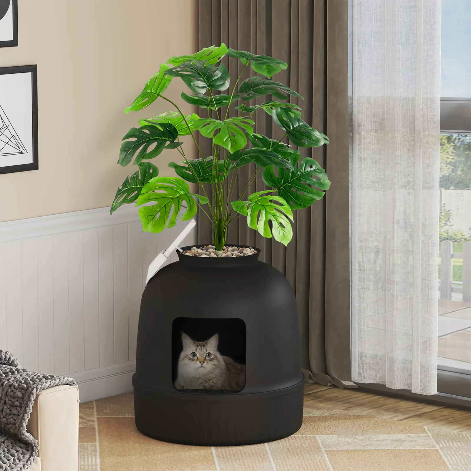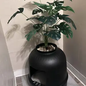 Really cute way to cover the litter box!! Works well, & looks like a real plant!! I really like it as I have alot of real plants & it just blends in.