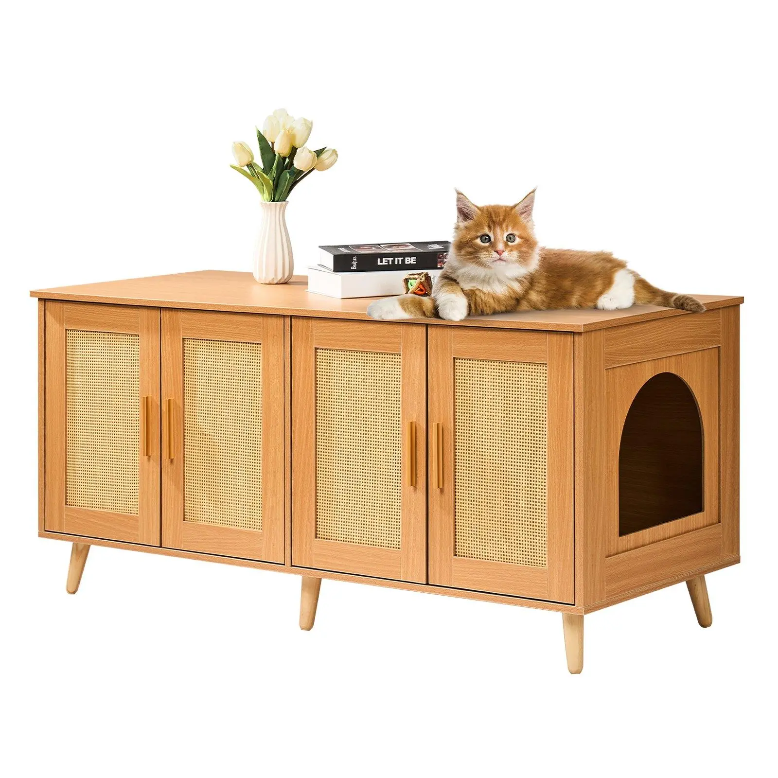 ·Hidden Aesthetic Design: The modern cabinet with rattan doors not only provides private space for your pet but also makes your room look neater. The wooden cat litter box enclosure can hide the cat litter box, perfectly matching the home decoration. Adopting a high-quality aluminum alloy handle, with a magnetic suction door, the opening is easy and smooth.