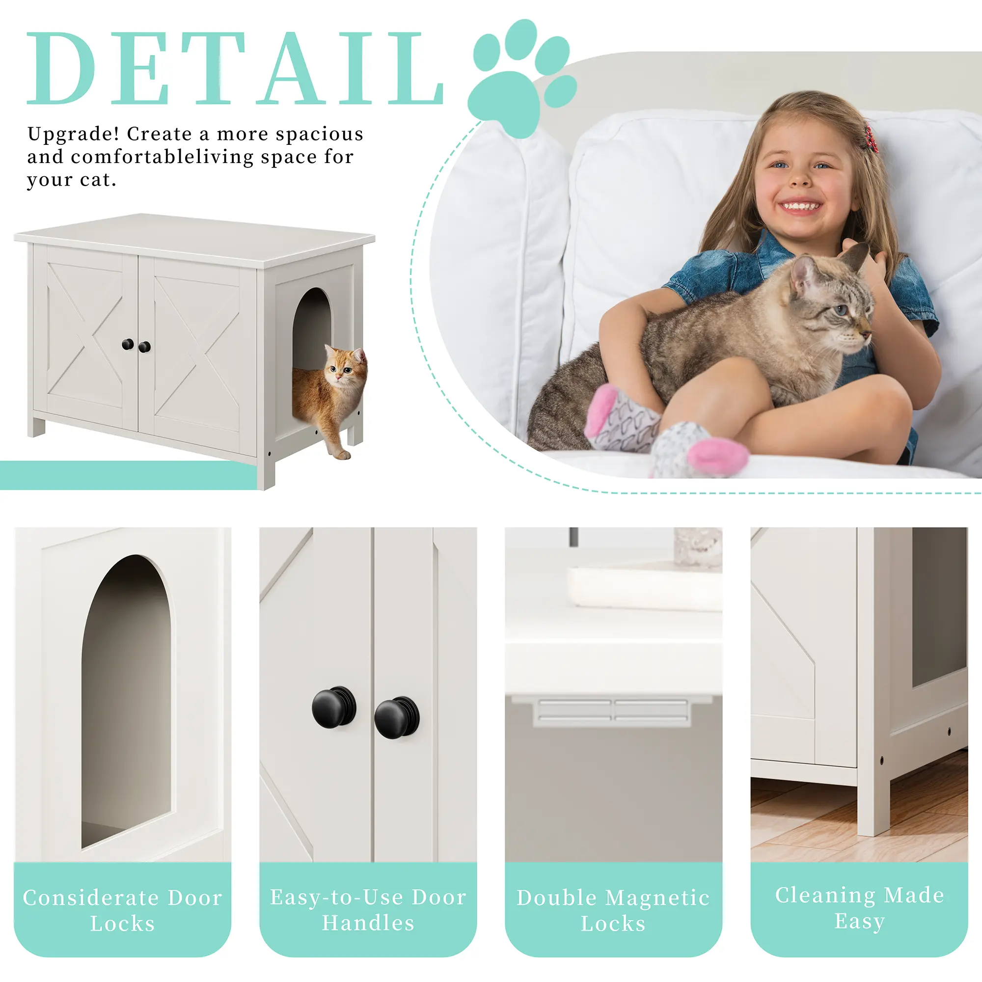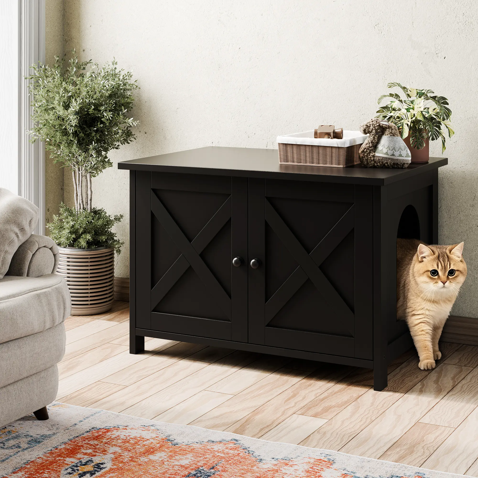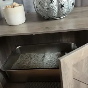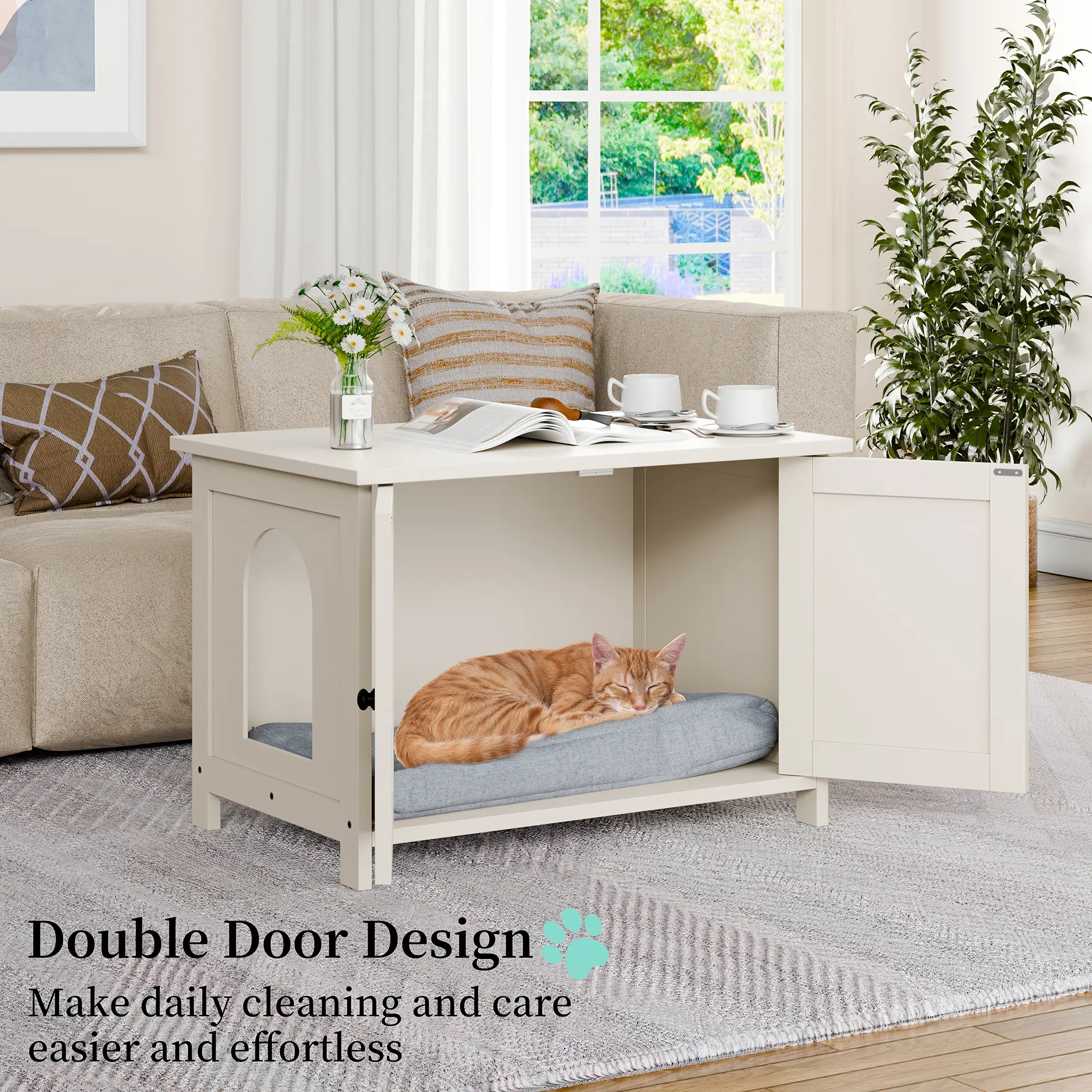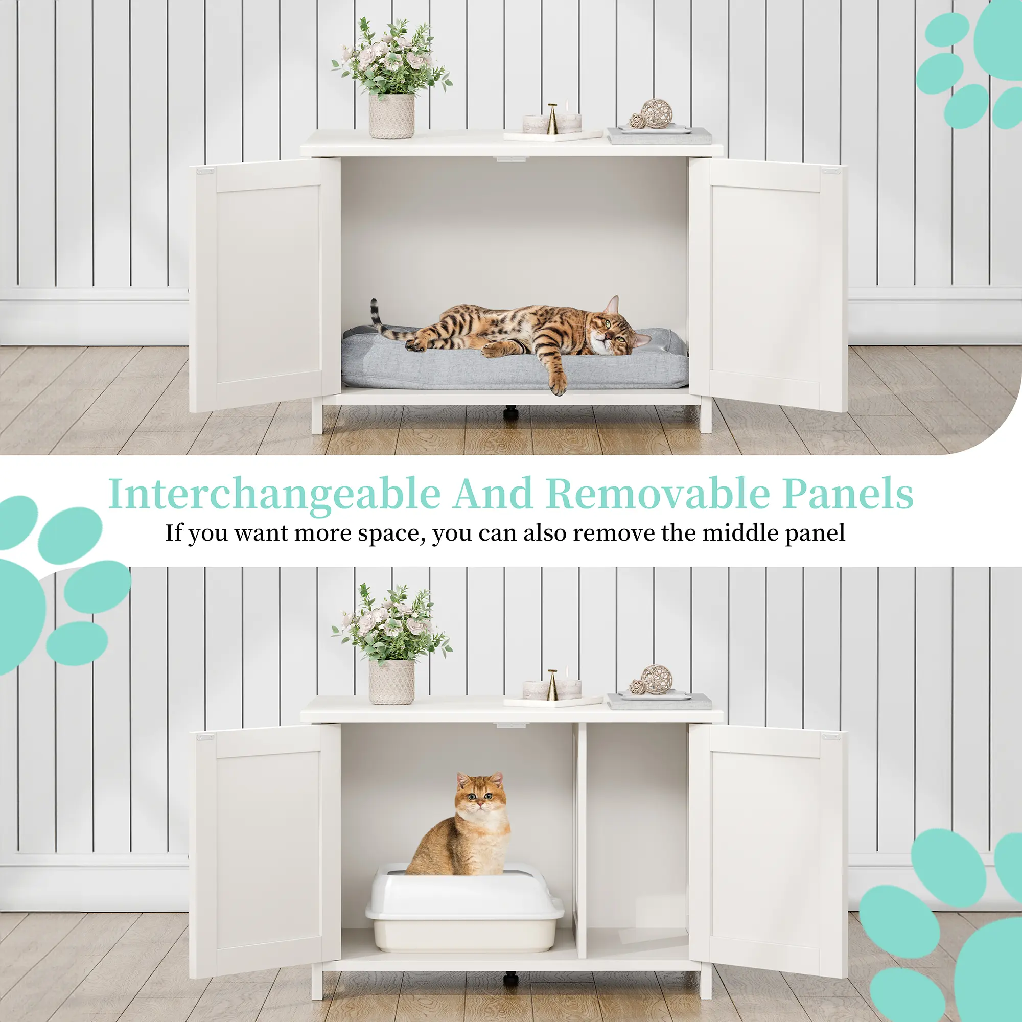 ·Hidden Privacy Fencing: The front and side panels can be opened or closed to create a concealed area, offering pets privacy while also discreetly housing litter boxes out of sight. This design balances functionality with aesthetic harmony in your living space.