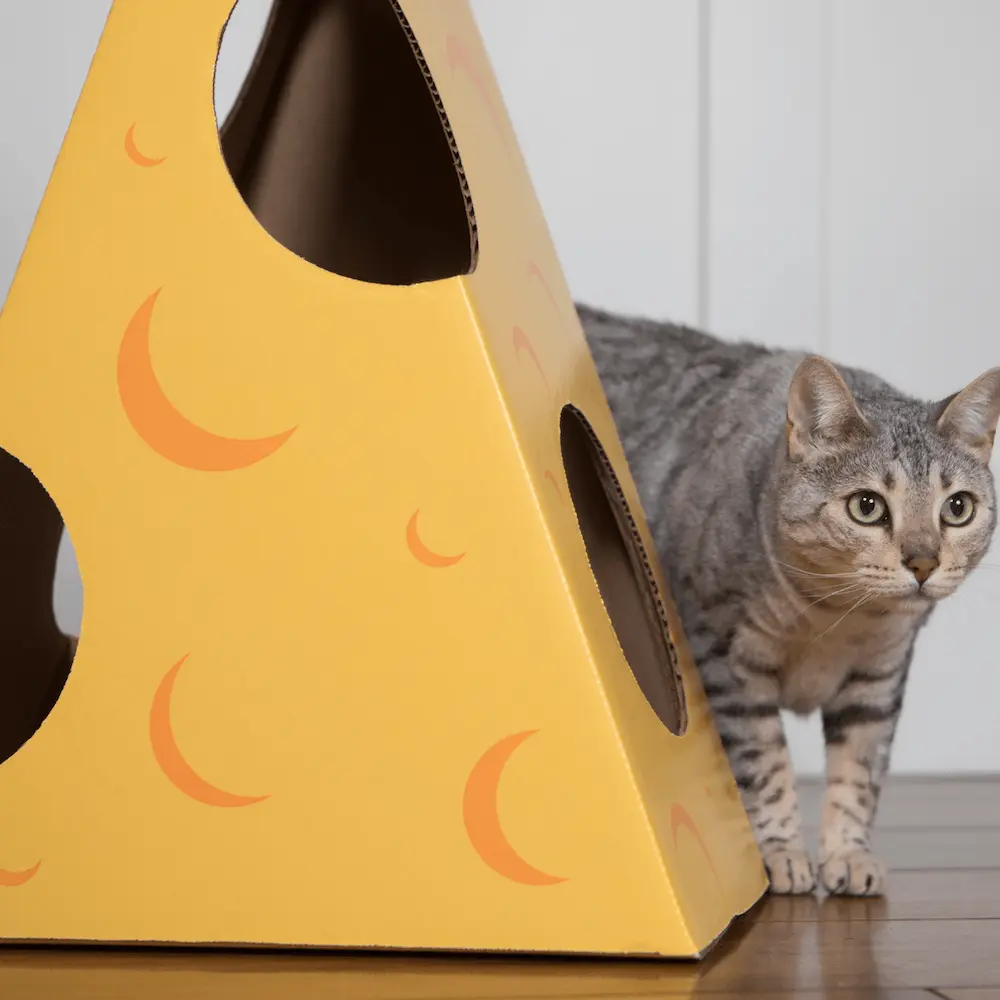 Does your cat love cardboard boxes? Are you living with dirty, ugly Amazon boxes in your home? Are you worried about your cat chewing or licking boxes that might not be safe? Our Monster Cheese Wedge cardboard cat house is clean, cat safe, fun and attractive! The Monster Cheese Wedge is a great cardboard box toy for box-loving cats. It's a wonderful piece of cat furniture or a cat cave for your cat to climb into and onto.