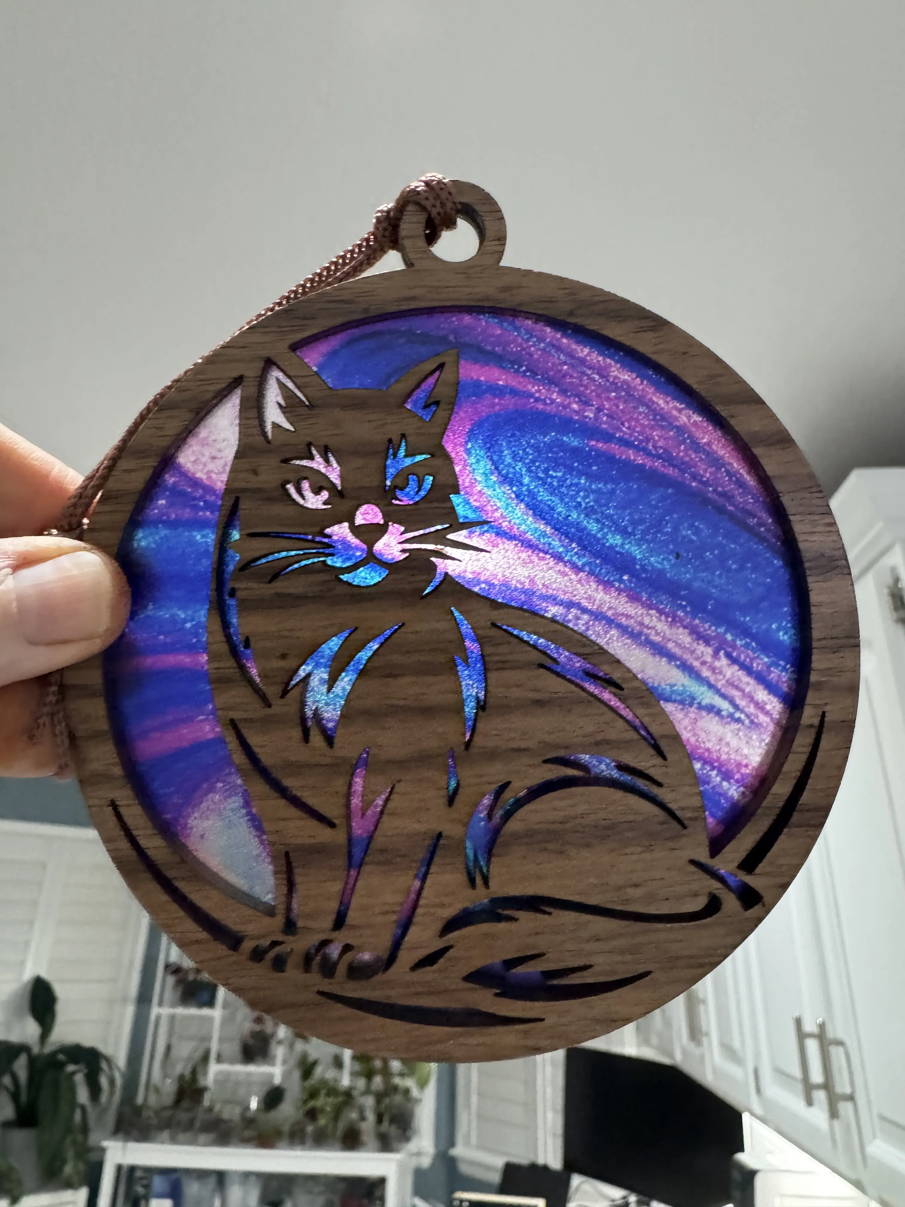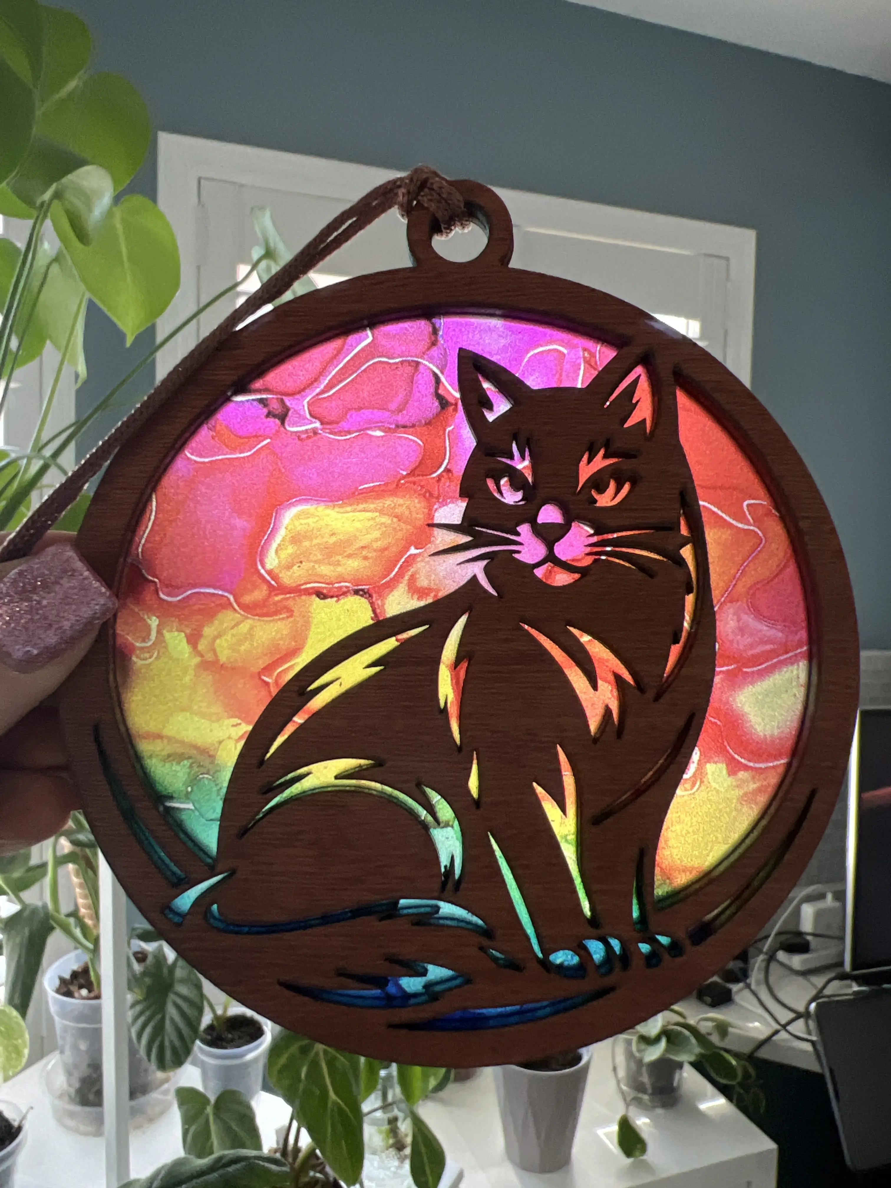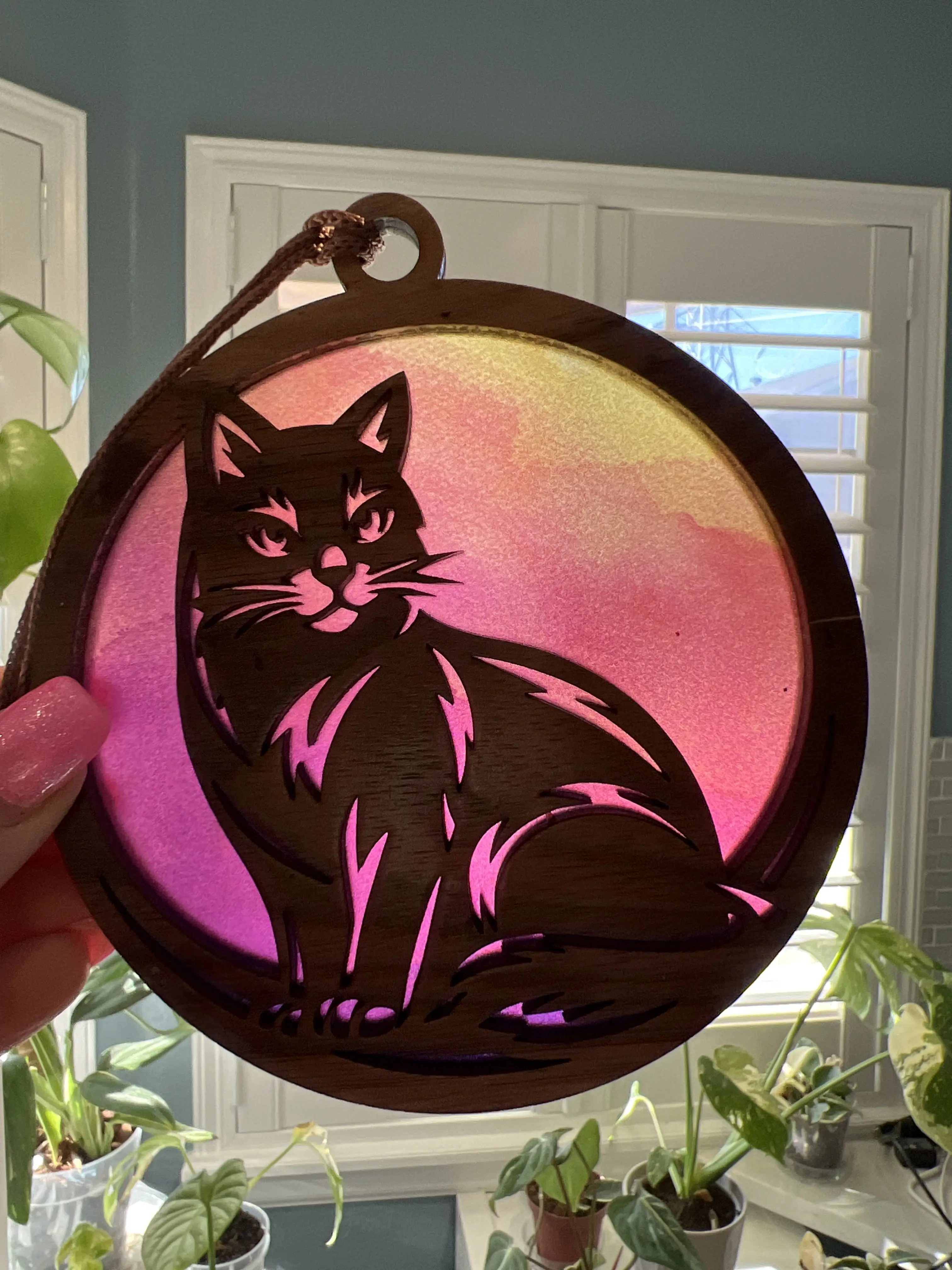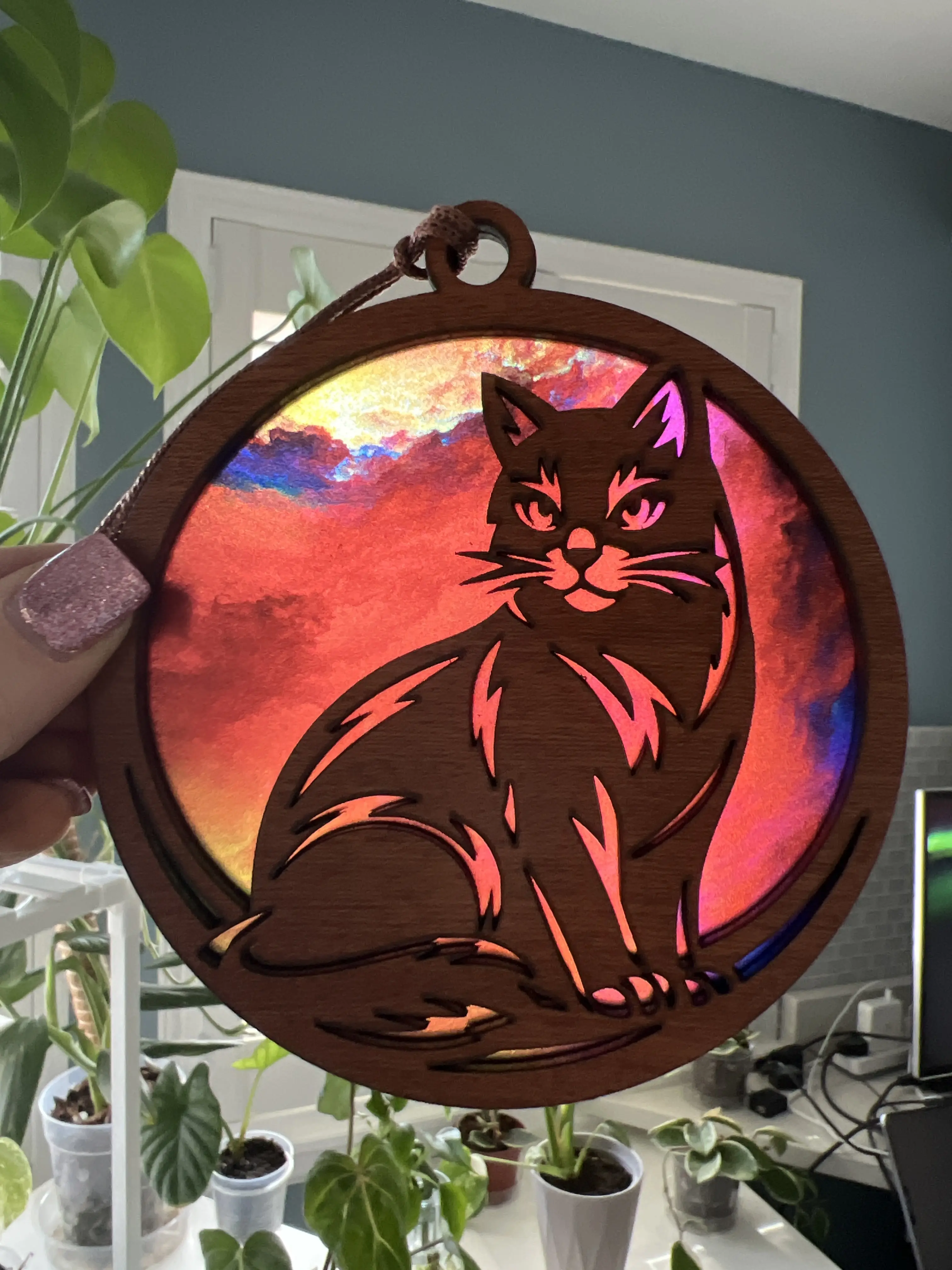 I love how beautiful my cat suncatcher is the quality is beautifully made i like that it comes with 2 ways to hang can't wait to hang mine . I recommend purchasing a suncatcher .