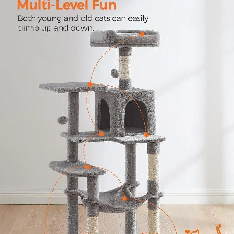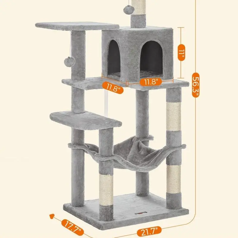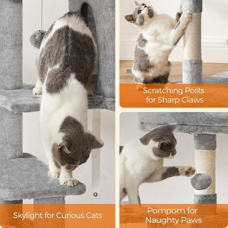 ·A variety of fun: With 2 pompoms, 1 cave, 2 perches, and a hammock, your cats won’t get bored on this cat play tower.