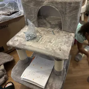Easy to assemble, took about 30 minutes. Only issue was staples in the slanted climber screw holes, but once removed it went together fine. Loved the instructions for turning the box into a cat house—my cat liked the box even more than the tree!