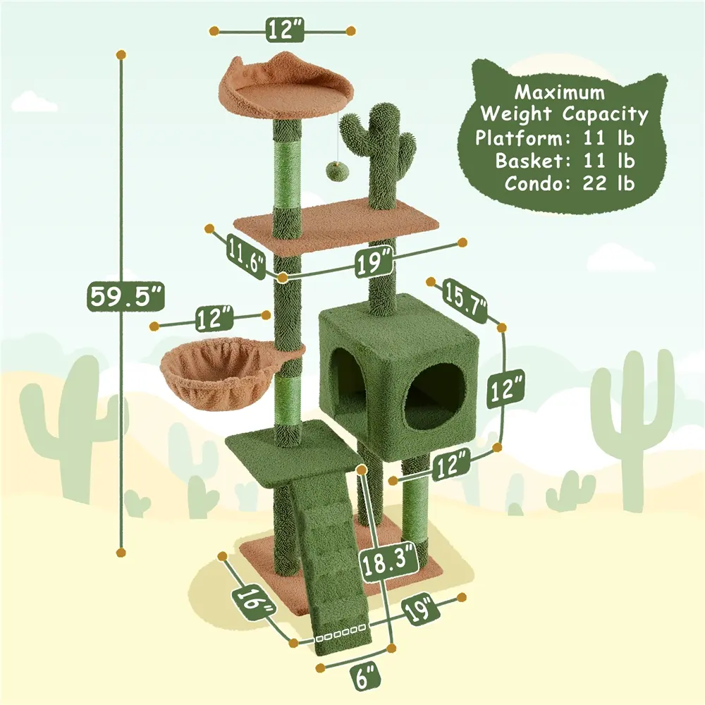 This adorable Cactus-Inspired Cat Tree is the ultimate playground for small to medium cats, featuring a cozy condo, a soft perch, a comfy basket, and sturdy sisal-wrapped scratching posts. With a kitten-friendly ramp, an anti-tip kit for safety, and a dangling toy ball, it’s designed for endless fun, comfort, and style. Ideal for homes with 2-3 cats, this unique piece adds a playful touch to your decor while giving your cats their own cozy oasis to climb, scratch, and snooze in.