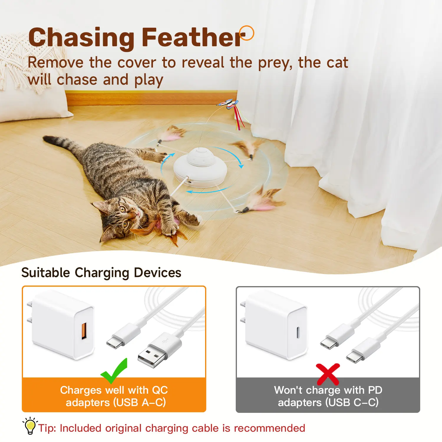 [Multi Modes]: Features a range of captivating movement modes that stimulate cat's natural instincts to chase, pounce, and play. 3 rotating modes of chasing feather; Simultaneous or seperate working of chasing feather and spinning butterlfy; What's more, the cover can be removed to expose the chasing feather completely for more fun. The diverse play options ensure your cat gets the mental and physical stimulation and enough exercise to eliminate boredom