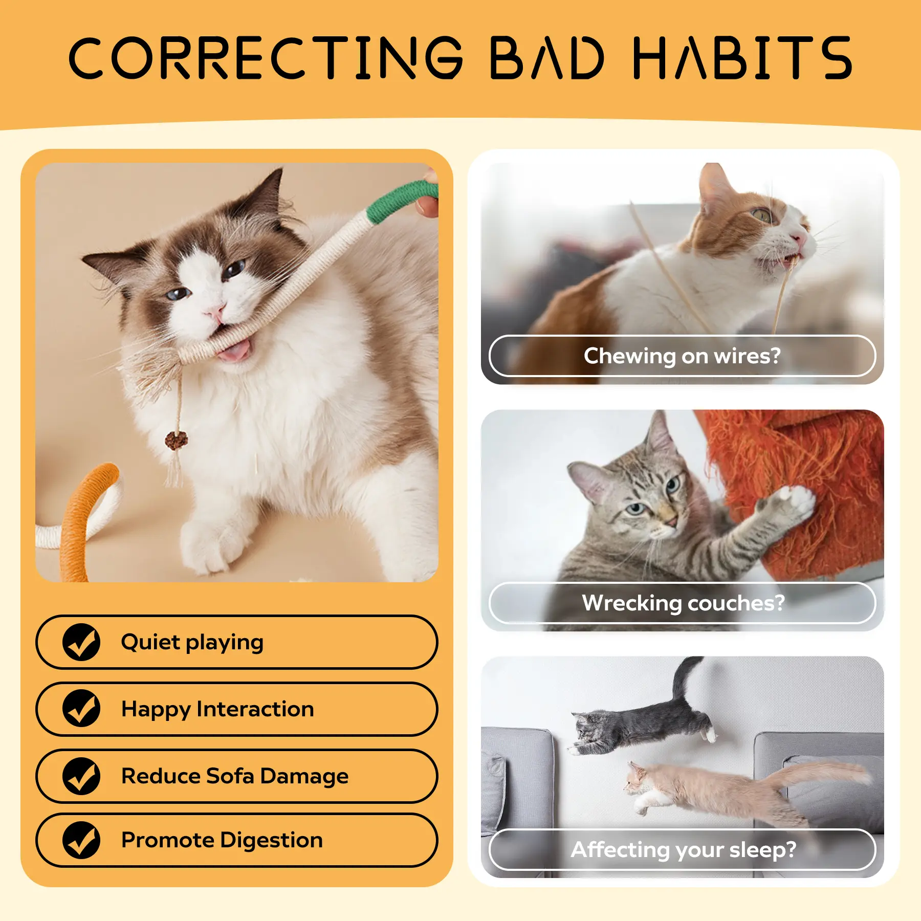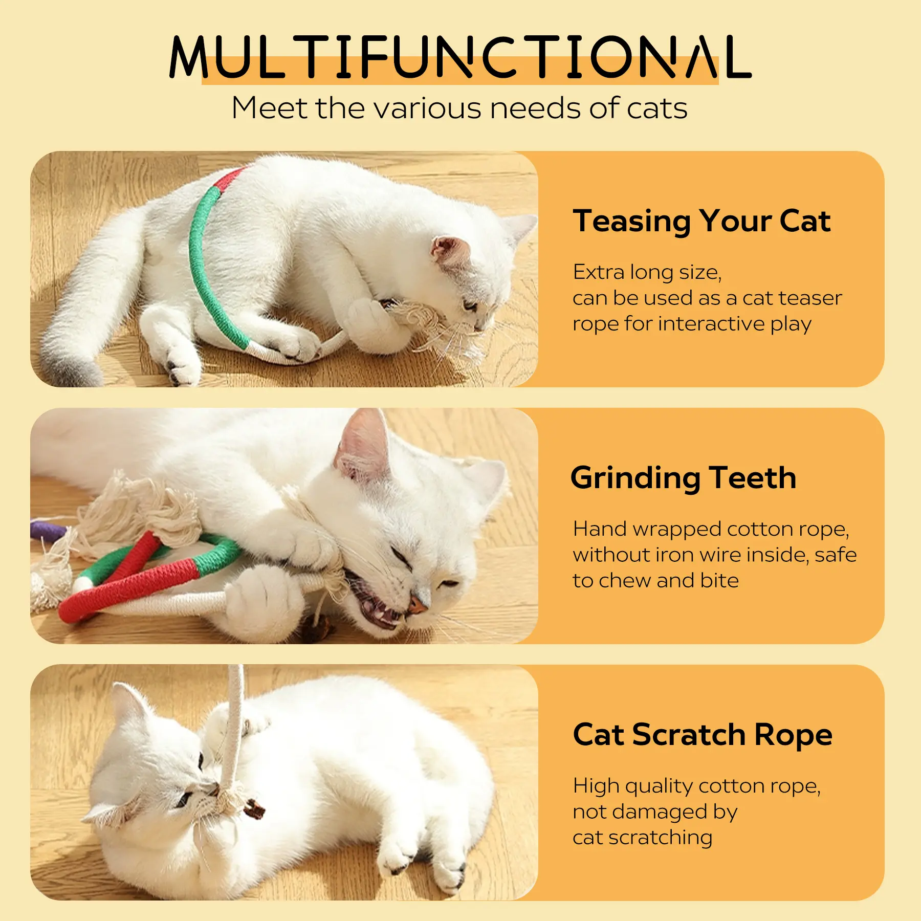 Ā·Interactive and Self Play: Our cat rope toy serves multiple purposes. It serves as an interactive toy for playing with your cat, enhancing the relationship between you and your furry friend. Additionally, it also works as a self-play toy, keeping your cat entertained even when you're not available to play with them