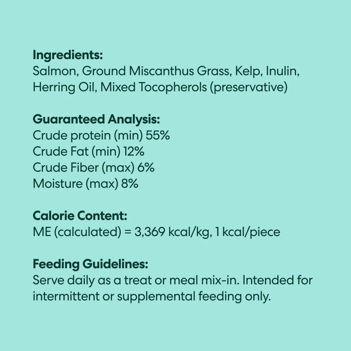 Salmon, miscanthus grass, kelp, inulin, herring oil, mixed tocopherols.