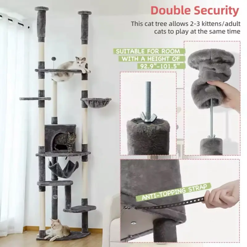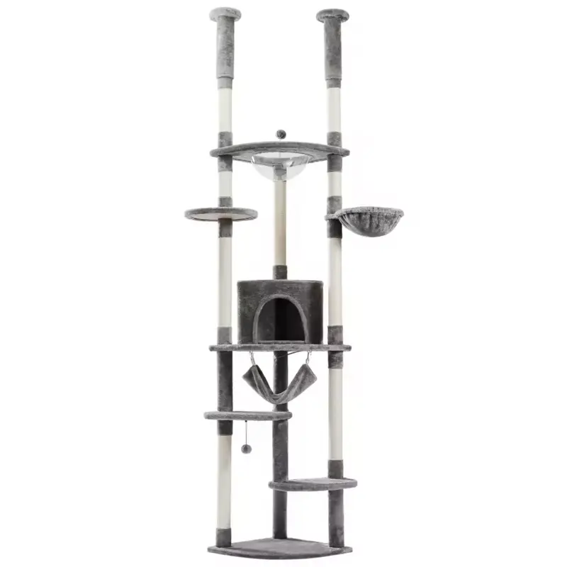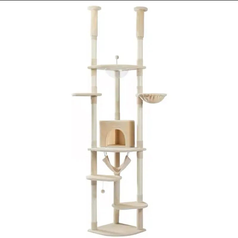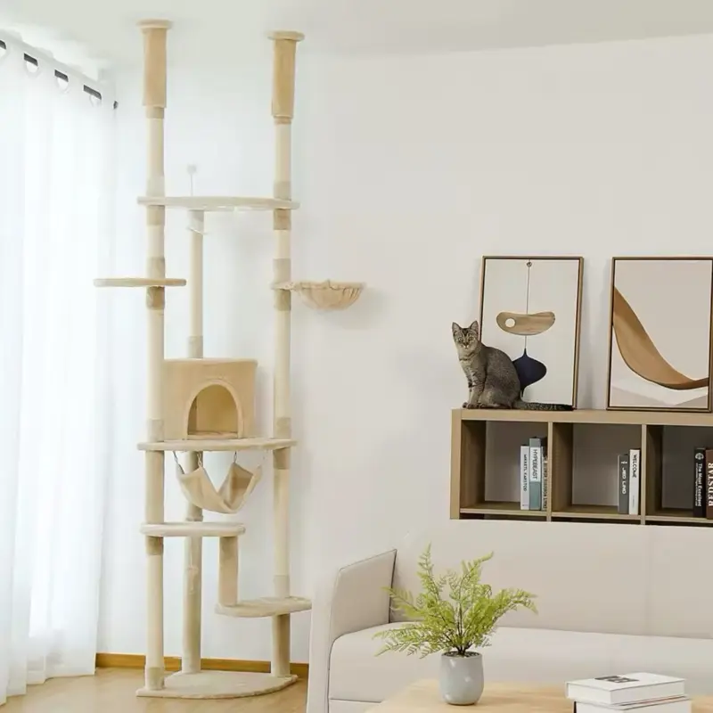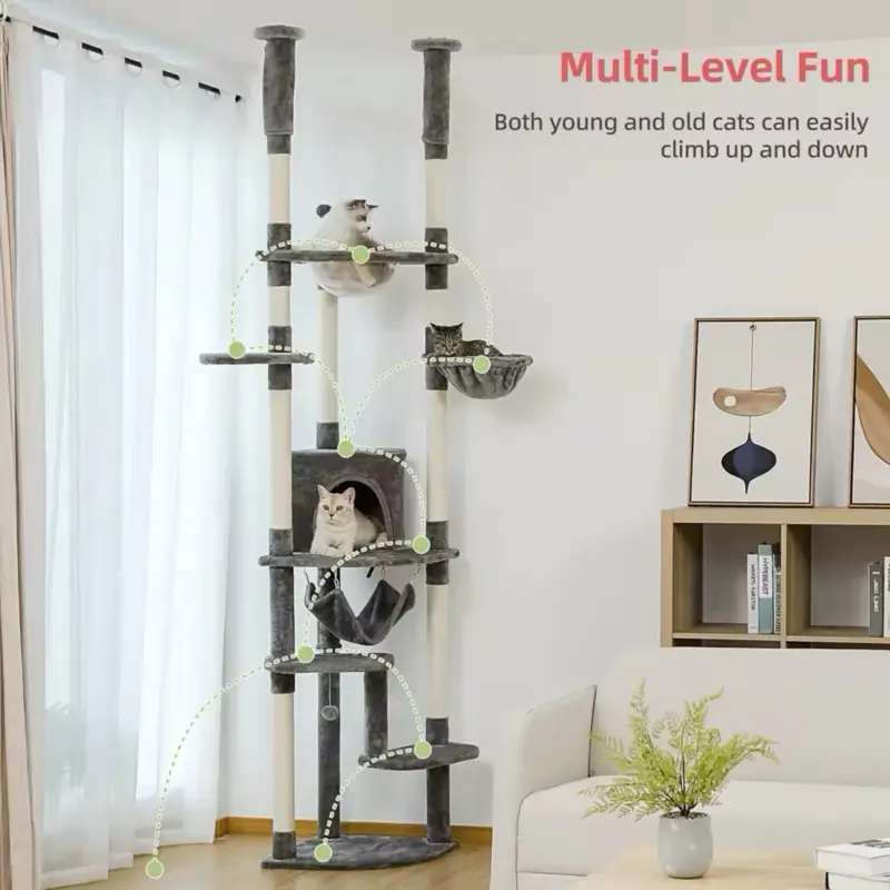 Give your feline friend a tall, space-saving playground with our Floor-to-Ceiling Adjustable Cat Tower! Designed for active and curious cats, this multi-level playhouse offers endless fun, comfort, and scratching opportunities.