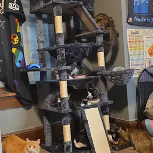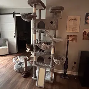 The Allewie 82” Tall Cat Tree is an impressive, high-quality tower built for multi-cat homes. It’s tall, wide, and extremely sturdy, giving cats plenty of vertical space to climb, jump, and relax. With multiple platforms, scratching posts, a roomy condos, and multiple cozy hammocks, it keeps cats active and comfortable all day. The wide base prevents wobbling, even with multiple cats playing at once. It’s perfect for my three boy cats, giving each of them their own space while sharing one massive, well-built tower.