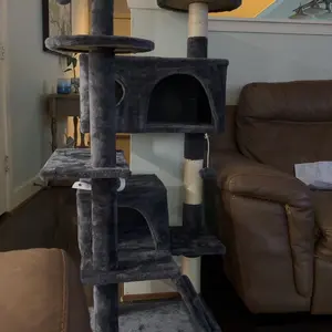 The cat tree is made of natural particle boards, covered with skin-friendly plush which is so comfortable and warm for your little king or queen to rest on. Strengthened with battens at the bottom to ensure overall stability, anti-dumping accessories ensure double safety.