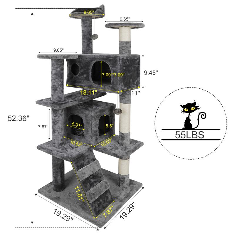 Overall dimensions: 19'' L x 19'' W x 52.36'' H. This multiple level cat tree is designed for more than one cat to play at the same time. 2 hideaway house with plenty of lounging room for your kitties to nap | 3 top perches platform can let cats observe like a queen | several layers of layout for climbing up and down.