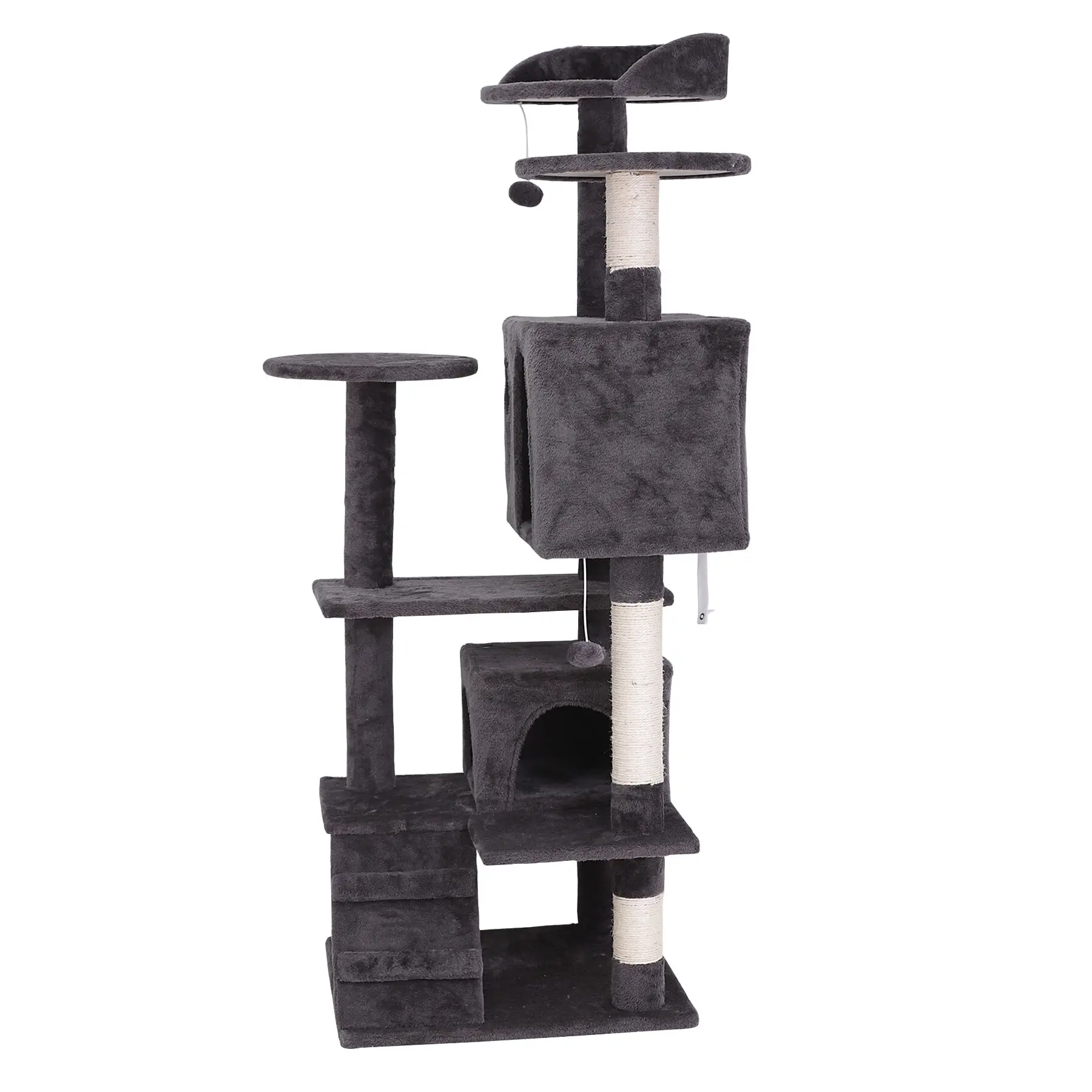 For added amusement, the cat tree comes equipped with two hanging fur balls, designed to withstand vigorous play without compromising integrity.