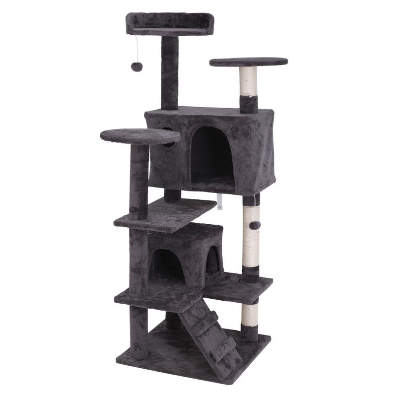 This cat tree features two roomy hideaway houses that provide cozy resting places. With three elevated perches at the top, cats can revel in their elevated vantage point, perfect for surveying their surroundings or watching outdoor activities through a nearby window. The multi-tiered structure is tailored to satisfy kittens' natural inclination to climb.