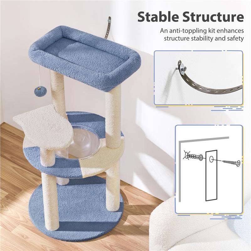 Inspired by the ocean, this marine-style cat tree sports an airy and playful color with a cute fish-shaped perch design. The transparent cat bed bowl resembles the window of a submarine, letting your kittens shuttle through the beautiful underwater world. Made from solid CARB P2-compliant particleboard and covered with soft plush, it is ideal for your energetic cats to bounce up and down. A spacious top perch with a thick raised rim that allows your cat's fluffy head to rest on when enjoying superb scenery out of the window. A fish-shaped platform provides enough space for your kittens to take a break or prance & play with the attached cat ball, and a cozy cat bed fits their body curve just right, ideal for a snuggly sleep.