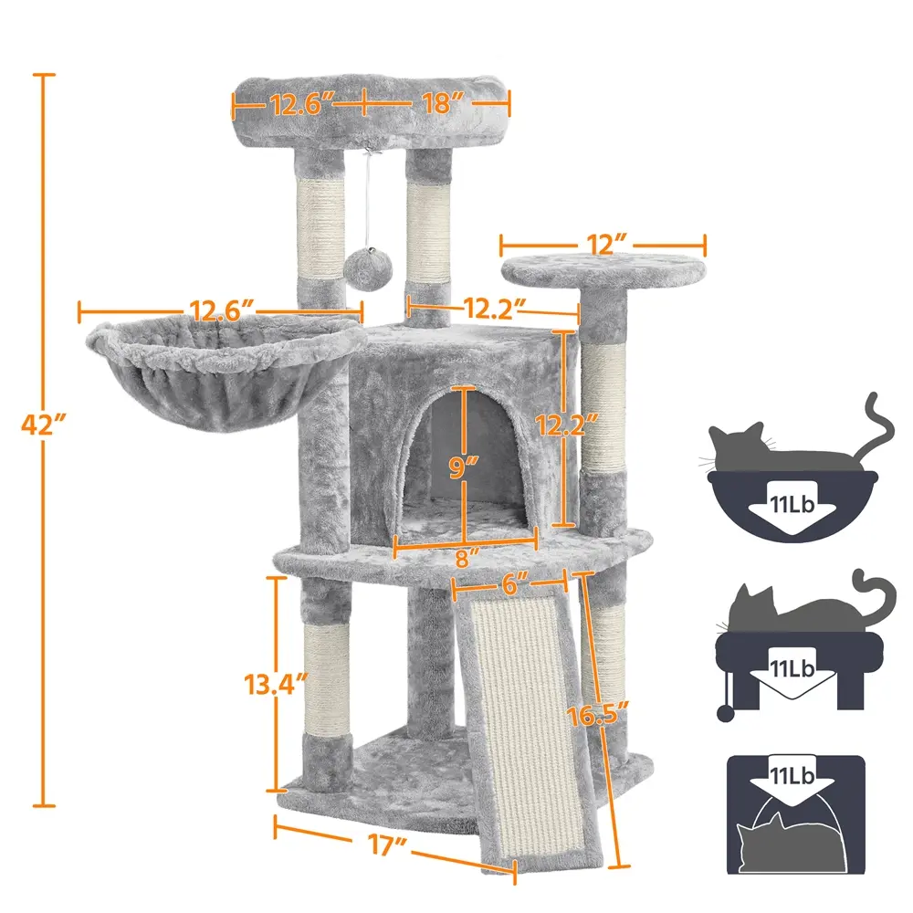 4. Quality Materials: Our cat tower is mainly constructed of solid particleboard and plush. This free-standing cat tree is capable of a strong load. It is very pet-friendly and durable for a long time, no hazardous substances to your cats and families