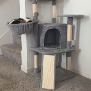 Our cat tower is made of selected particleboard and covered by soft plush and connected by metal accessories. This cat tower has different levels for cats to play and sleep, the condo, platform, basket, etc. Also, there are several scratching posts and a scratching board for cats to exercise. This quality cat tree will not let you and your cats down.