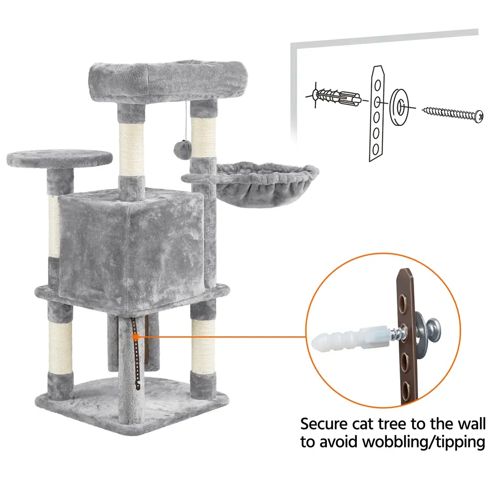 6. Security & Protection: Considering the cats’ habits and characteristics, we add an anti-toppling plastic strap which is attached to the middle board for better stability, through which you can anchor the cat tree to the wall