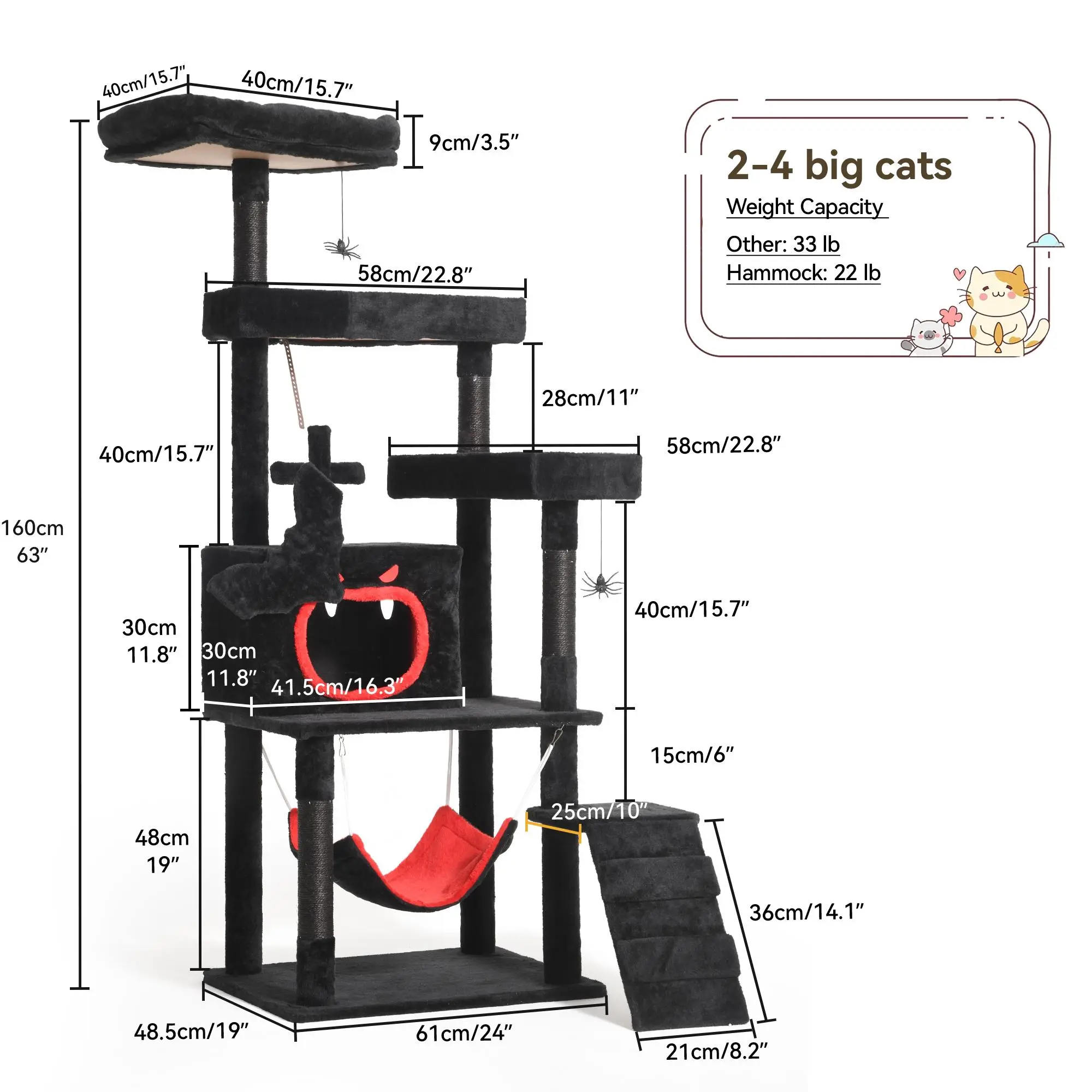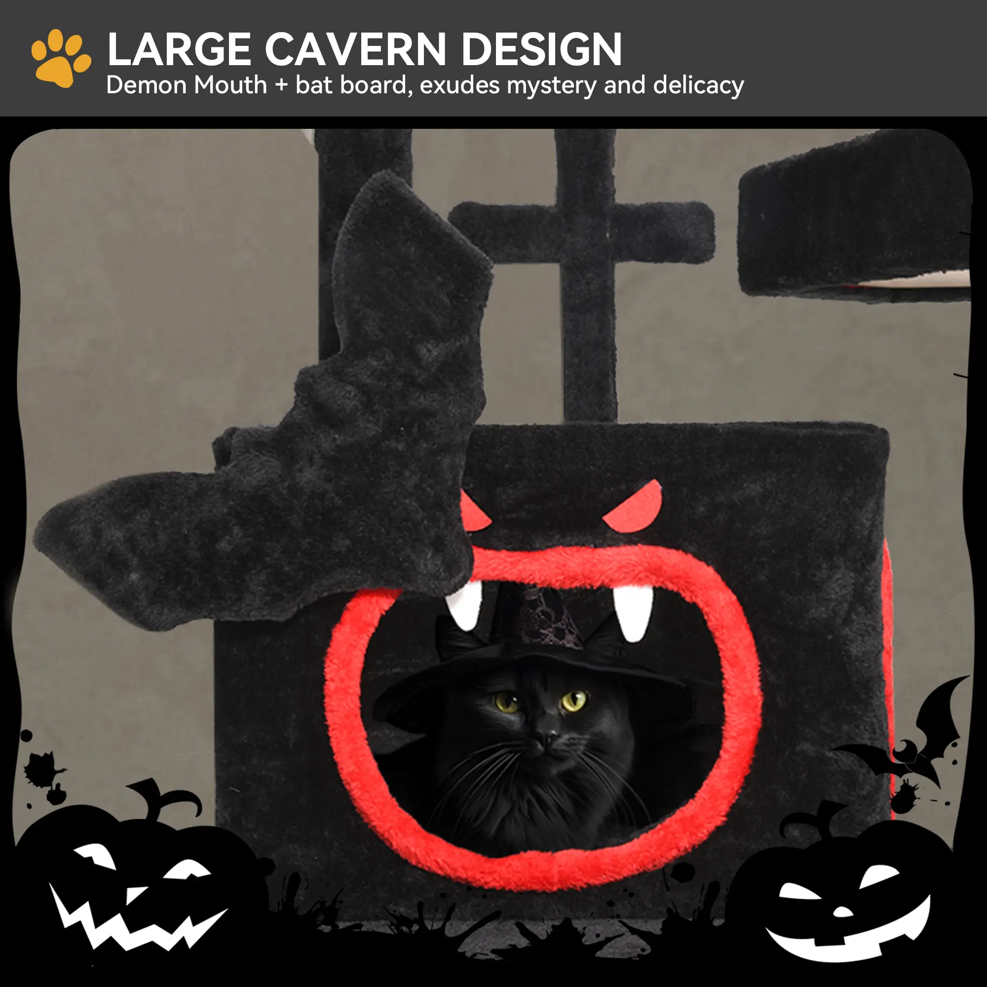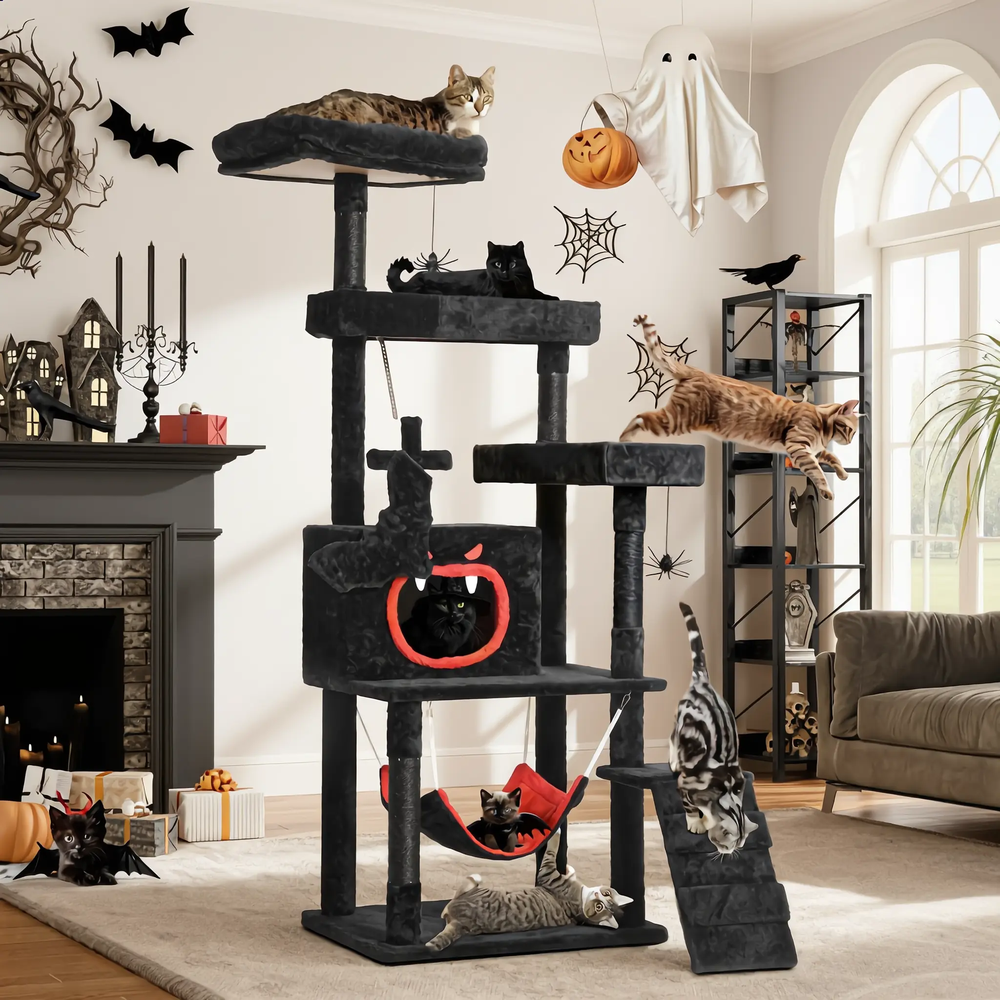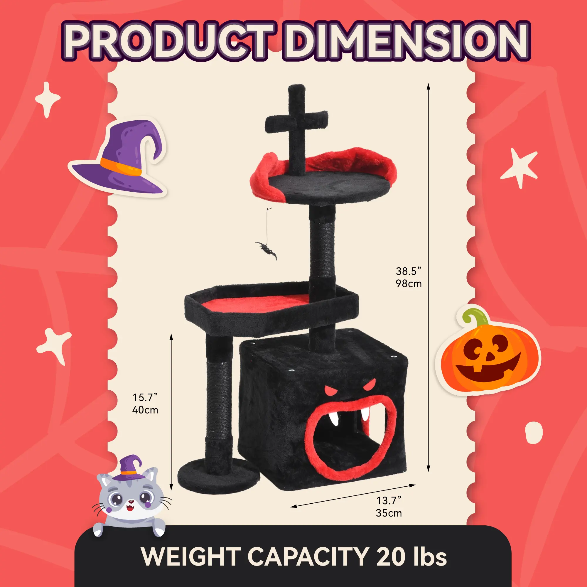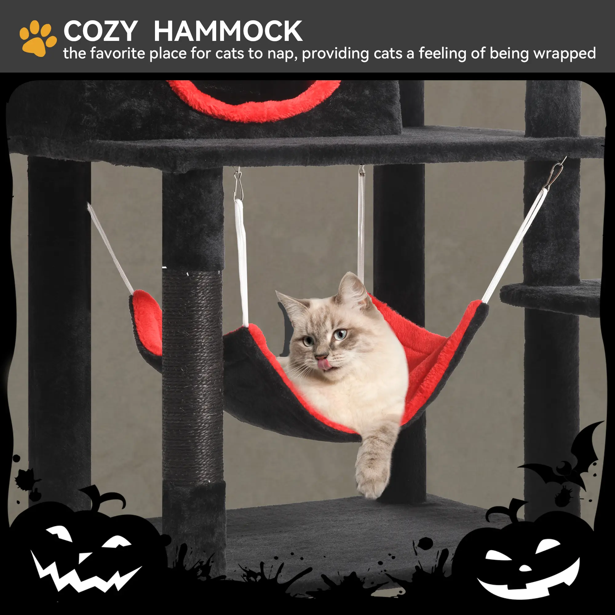 Gothic Style Design: Featuring black and red plush fabric and a haunting design, this cat tower for indoor cats emanates a darker, more sophisticated allure; The feline furniture not only mesmerizes cat interest but also acts as a distinctive Halloween-themed home decor item