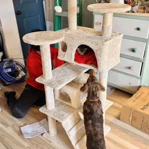 This eye-catching cat tree doubles as a stylish piece of pet furniture, blending seamlessly with your home decor. It comes with all the necessary hardware and tools for quick and hassle-free assembly.