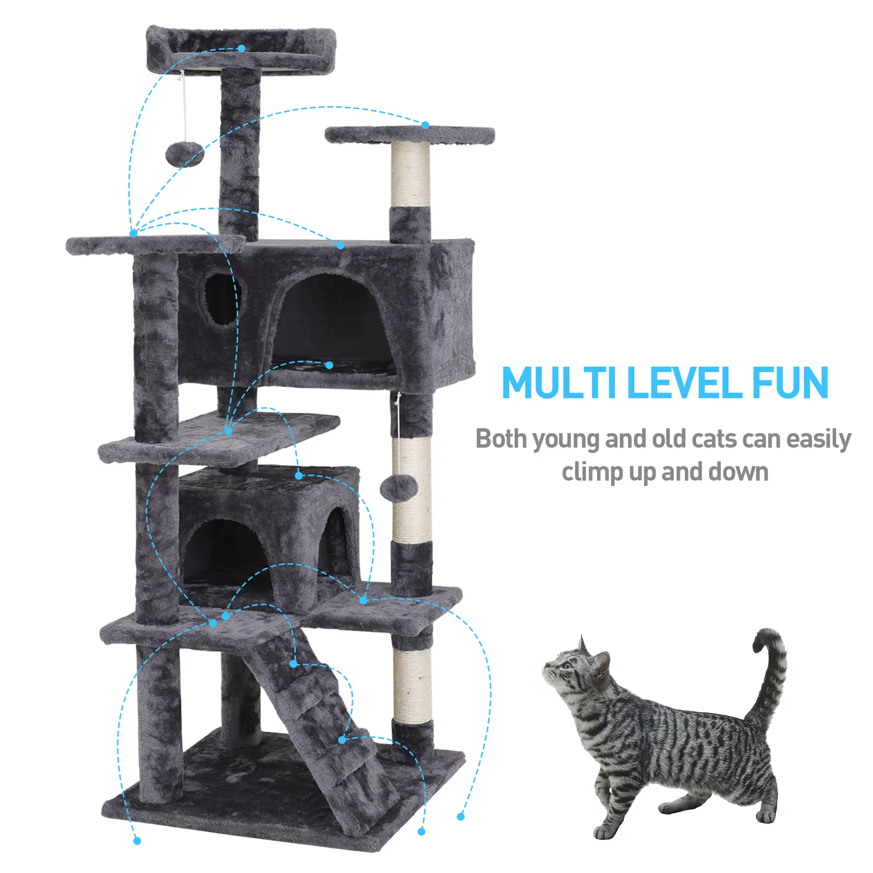 Safety is a top priority. The reinforced bottom base ensures maximum stability, and anti-toppling fittings are included for added security, giving you peace of mind while your cat plays.