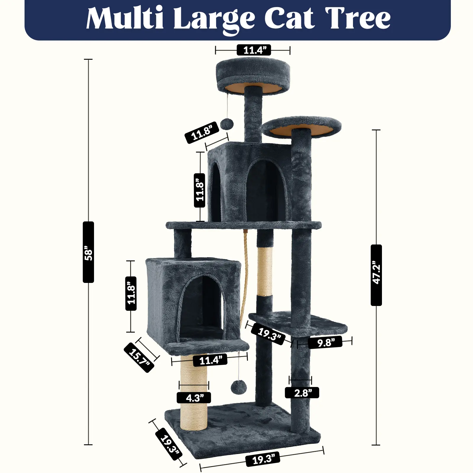 [Huge Versatile Fun Center]: Your cats can overlook the world on a 58" high platform, play around in two warm condos large enough, our versatile cat tree meets all the life needs of your kittens. Spoil your cats our huge cat tree!