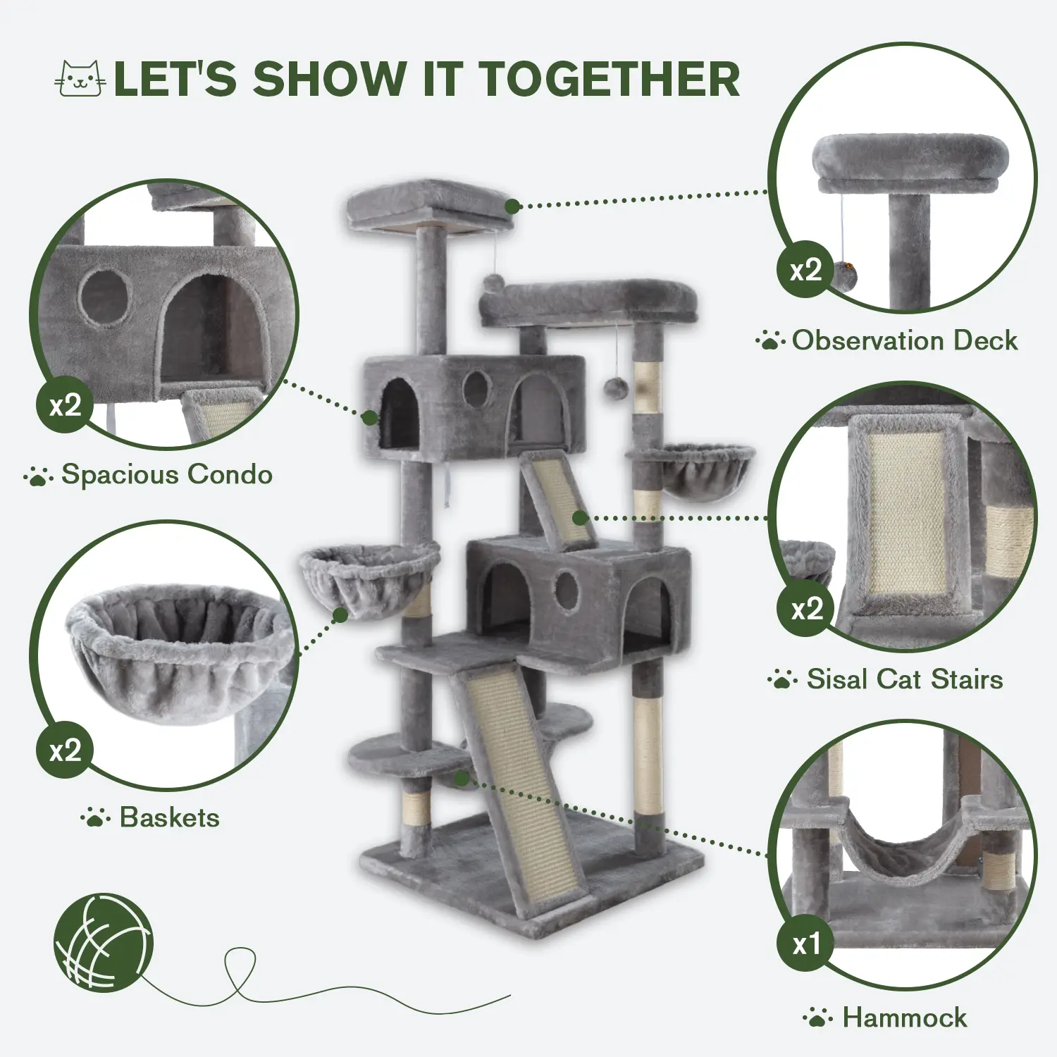 she loves it theres so much room it does come with a ball to play with two hidey holes she lays in both and she loves scratching the stairs the texture isnt the same as the stuff wrapped around i think she prefers scratching the stairs she uses the hammocks as well the assembly was pretty easy