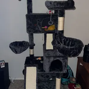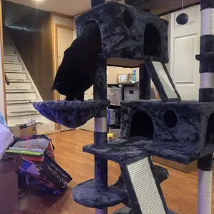 This is a beautiful cat tower. It is super tall with lots of cubby holes and bed areas to sleep on. It comes complete with scratching areas built in and hanging balls to entertain your cats. I am so pleased with this tower. I highly recommend getting one for your feline friends.