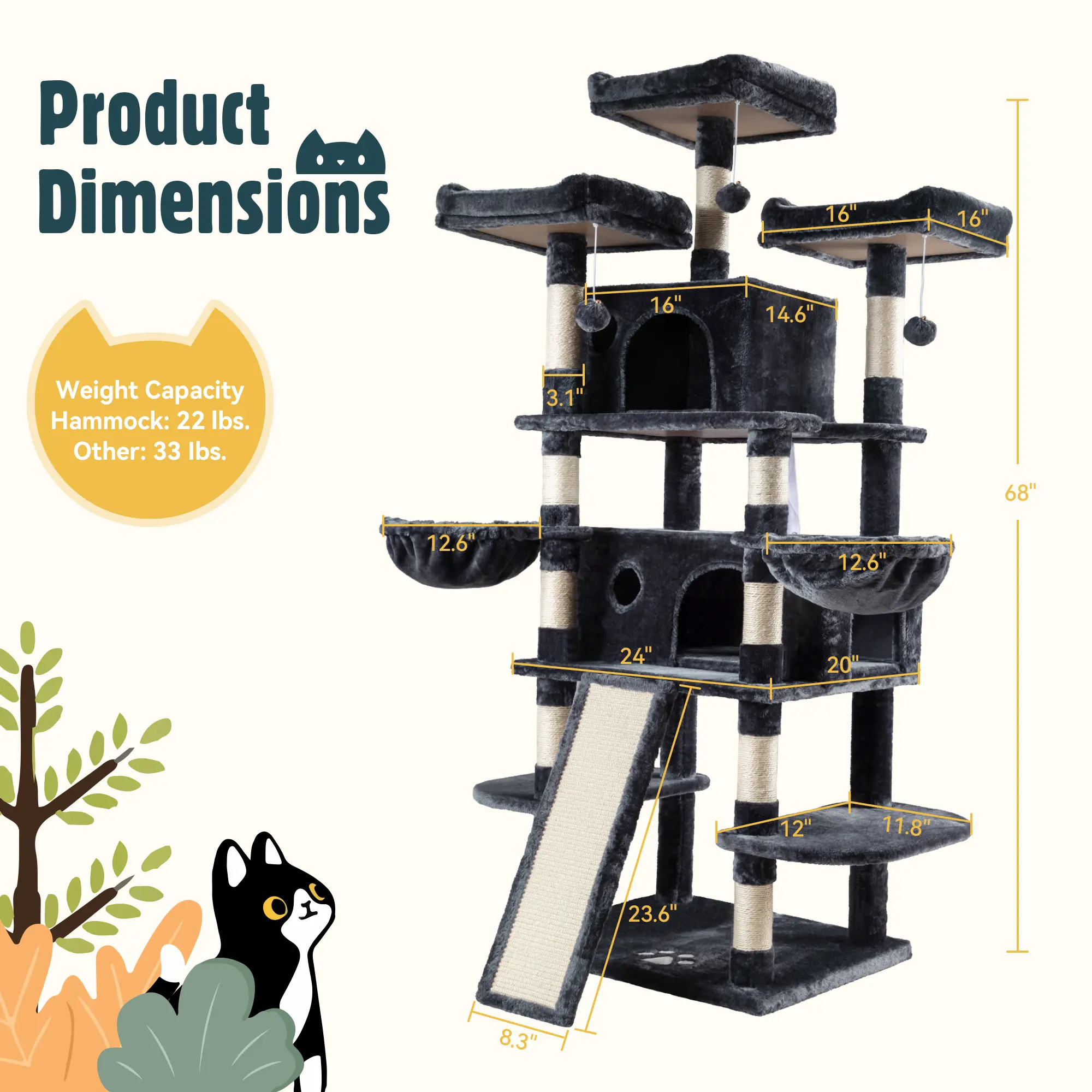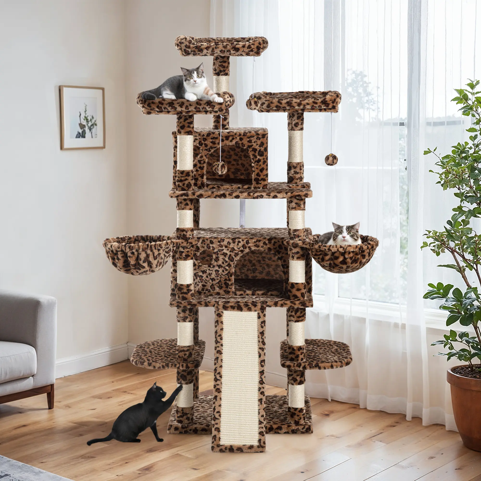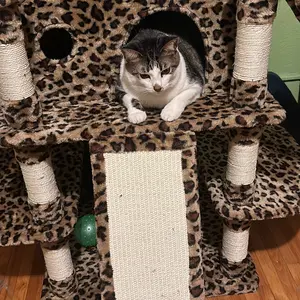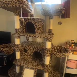 It’s so tall and spacious for my cats to lay on and go in I recommend if you have three cats like me and it’s has more than enough areas for them to lounge on also many scratching posts and hanging toys too