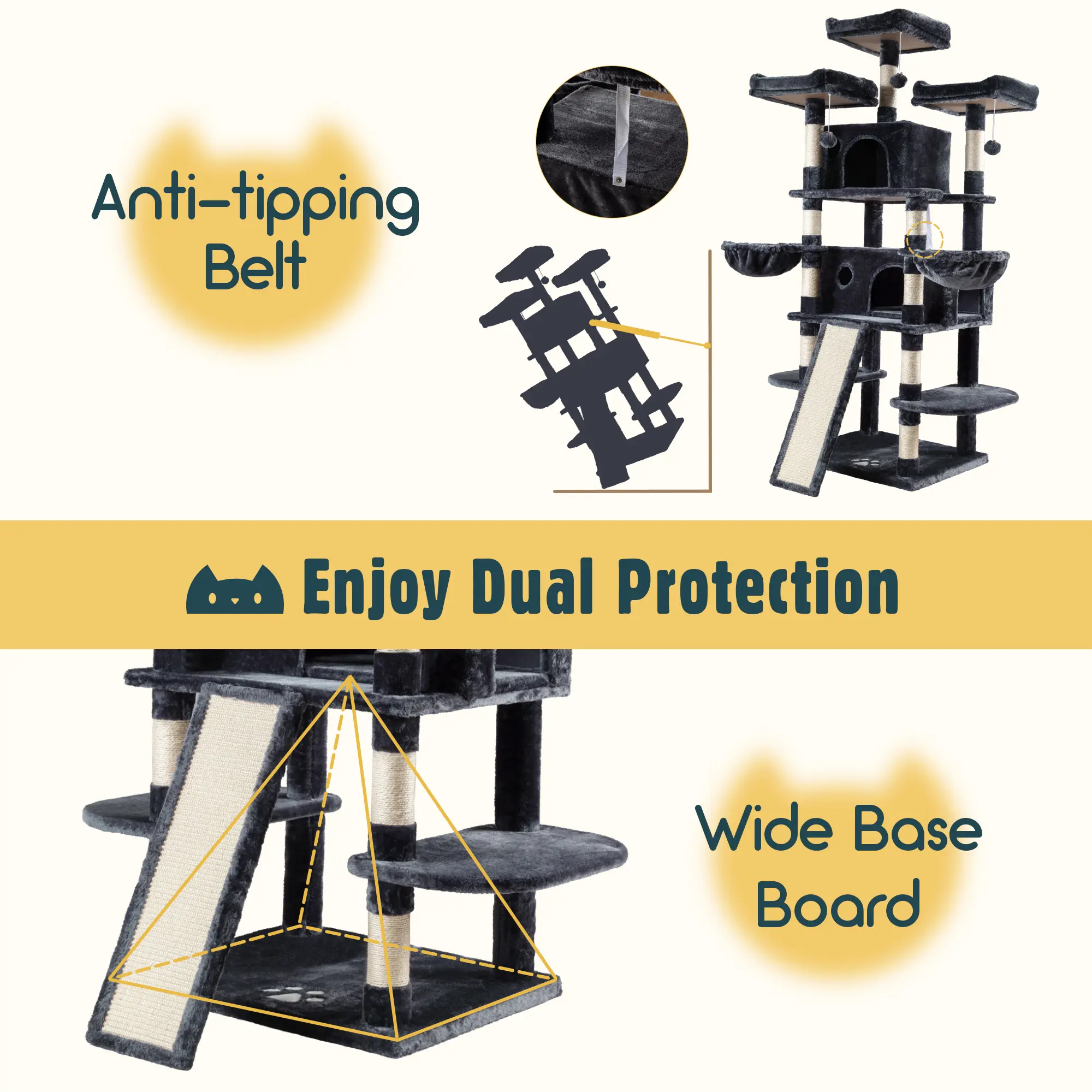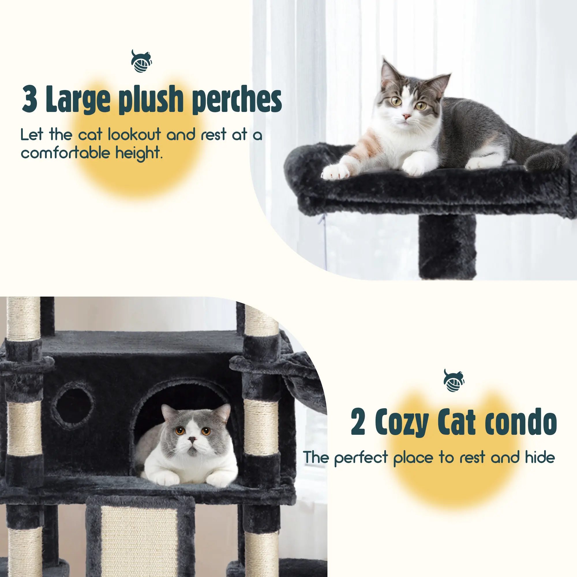 Love this cat tree!!! Very sturdy my cats are in love. I have 3 big cats and they fit perfect in this cat tree. Assembly was fairly simple i would highly recommend to any who has cats more than enough room for big cats and they will love it.