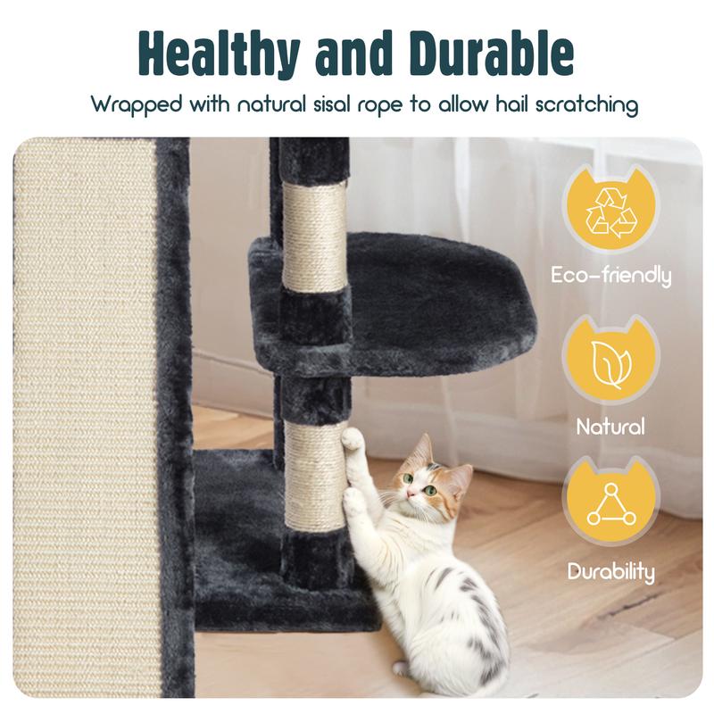 Multifunctional Activity Center: The cat tree offers 3 top perching platforms and 2 snug condos.Whether your kitten desires to stretch on a broad perch, curl up in a plush cave-like room, or satisfy the urge to scratch on a sisal pole, this multifunctional cat tree tower serves ideally as a recreational paradise, capable of filling your furry baby's day with fun and excitement!