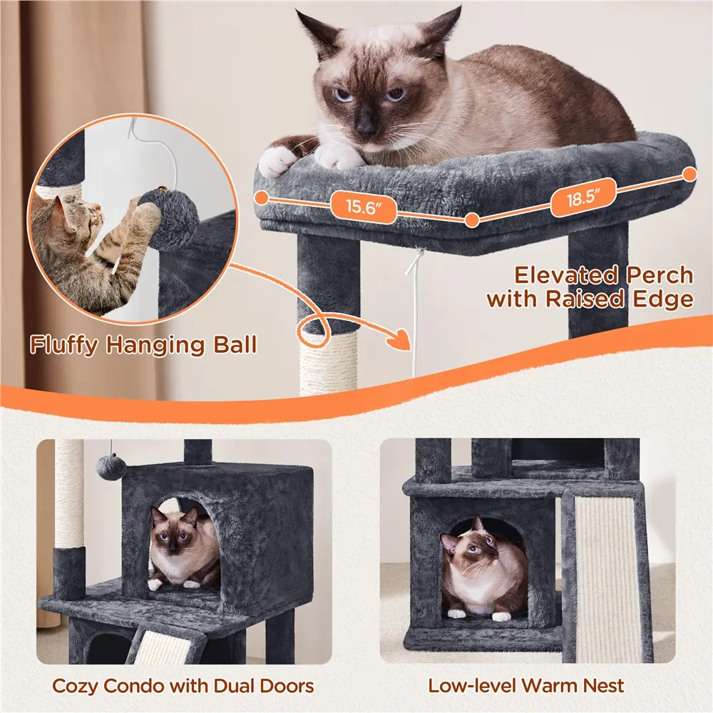 This multi-level plush cat tree is built to last with durable particleboard, metal, natural sisal rope, and plush fabric. It's both a playground and a cozy bed for your cute friends. The high perch with raised edges offers a perfect spot to lounge, while the two condos provide a secure, quiet space for sleeping. Each condo has two doors for easy access. A sisal-wrapped scratching post and a scratching board give your cats a place to play and exercise, keeping your furniture safe from scratches.