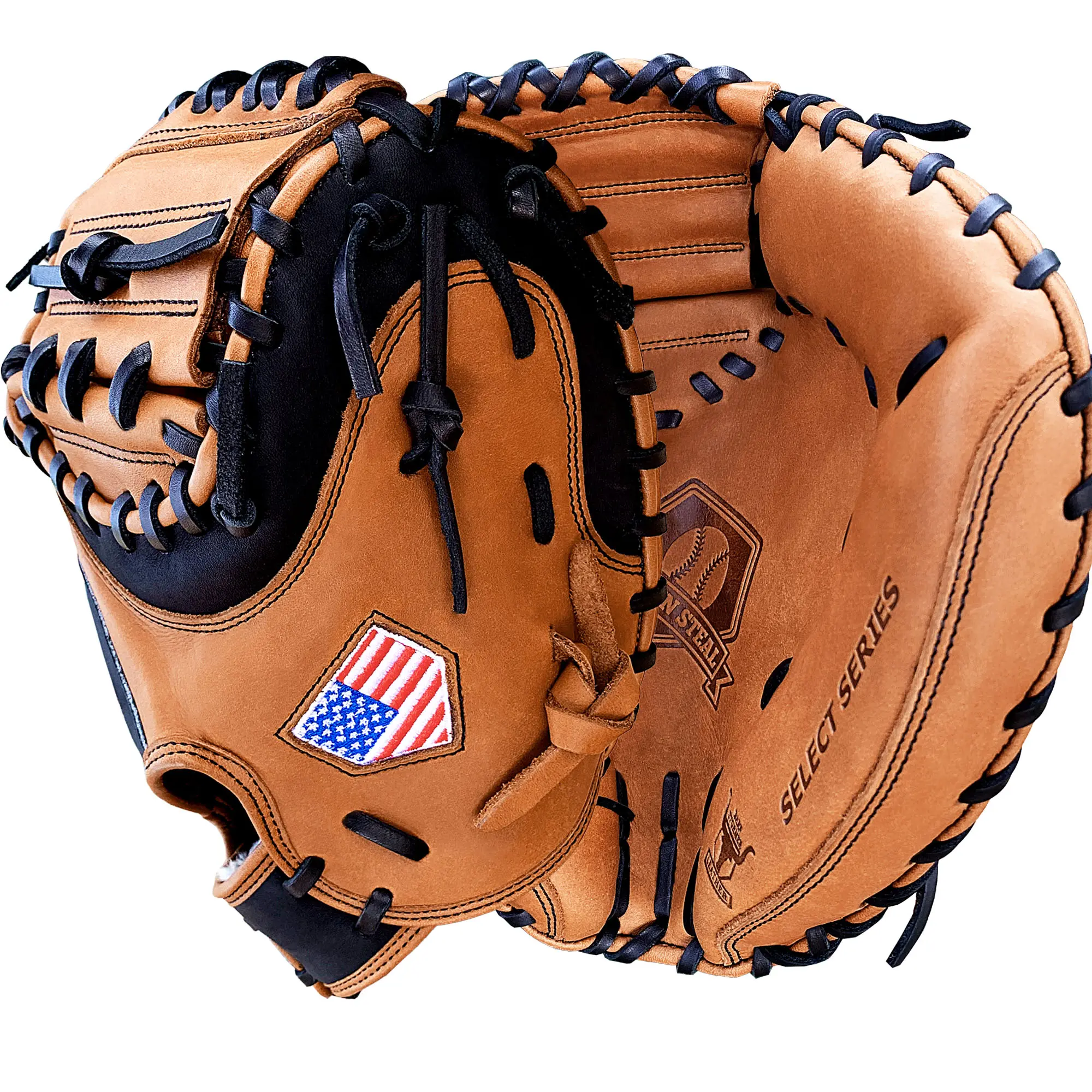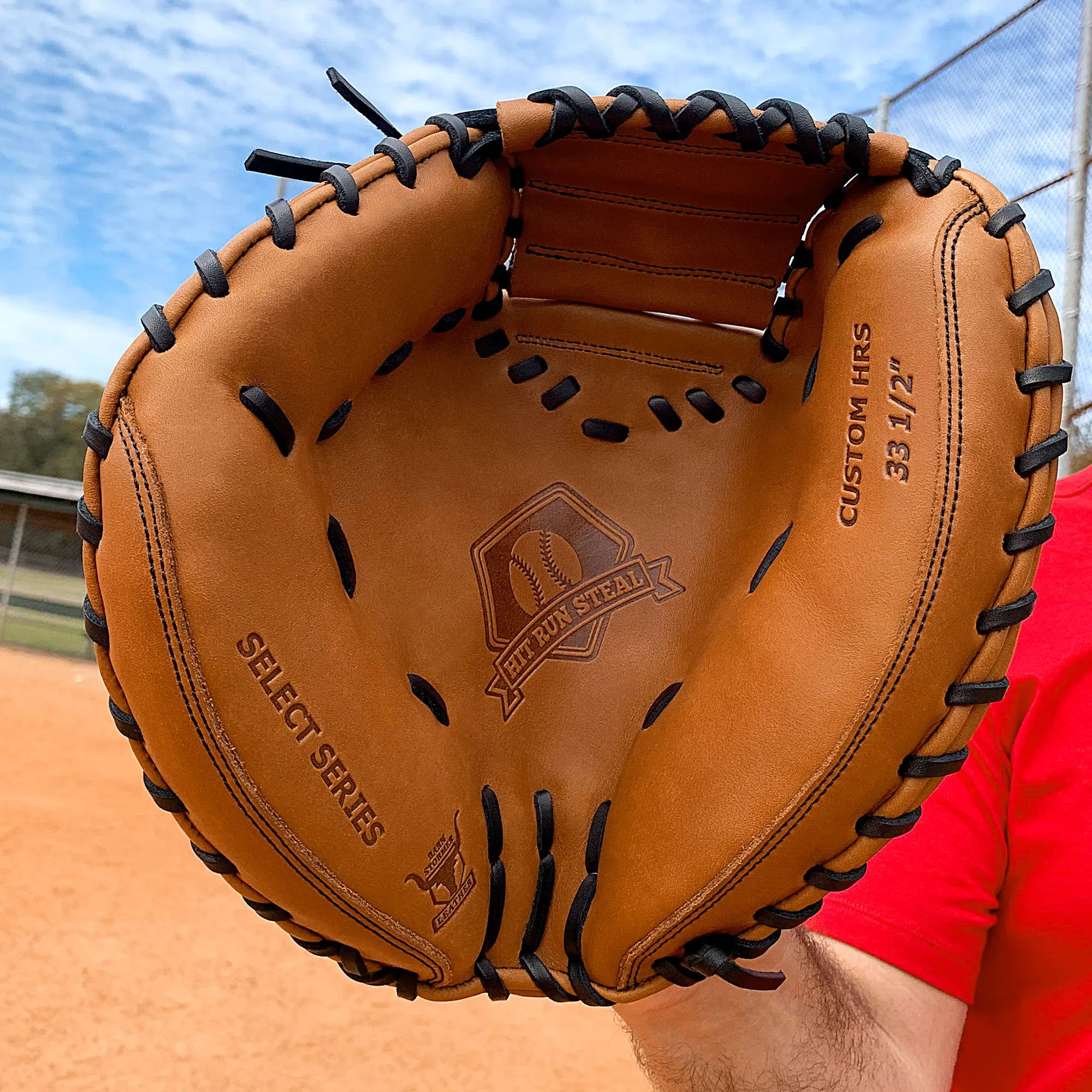 The 33.5 inch baseball catcher's glove with a half moon web, is made from American Steerhide Barnstormer leather for ultimate comfort and quality. The softness of the leather will allow you to form the perfect pocket.