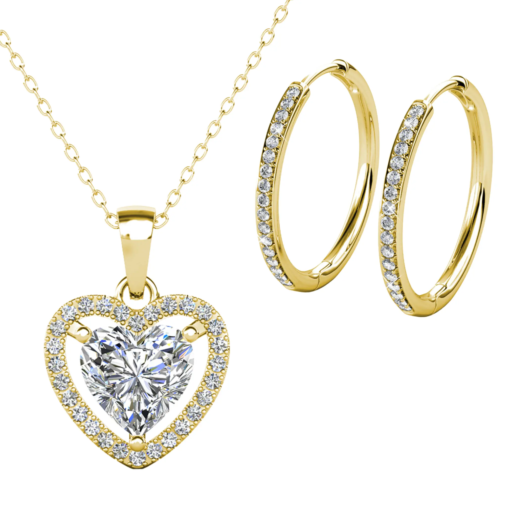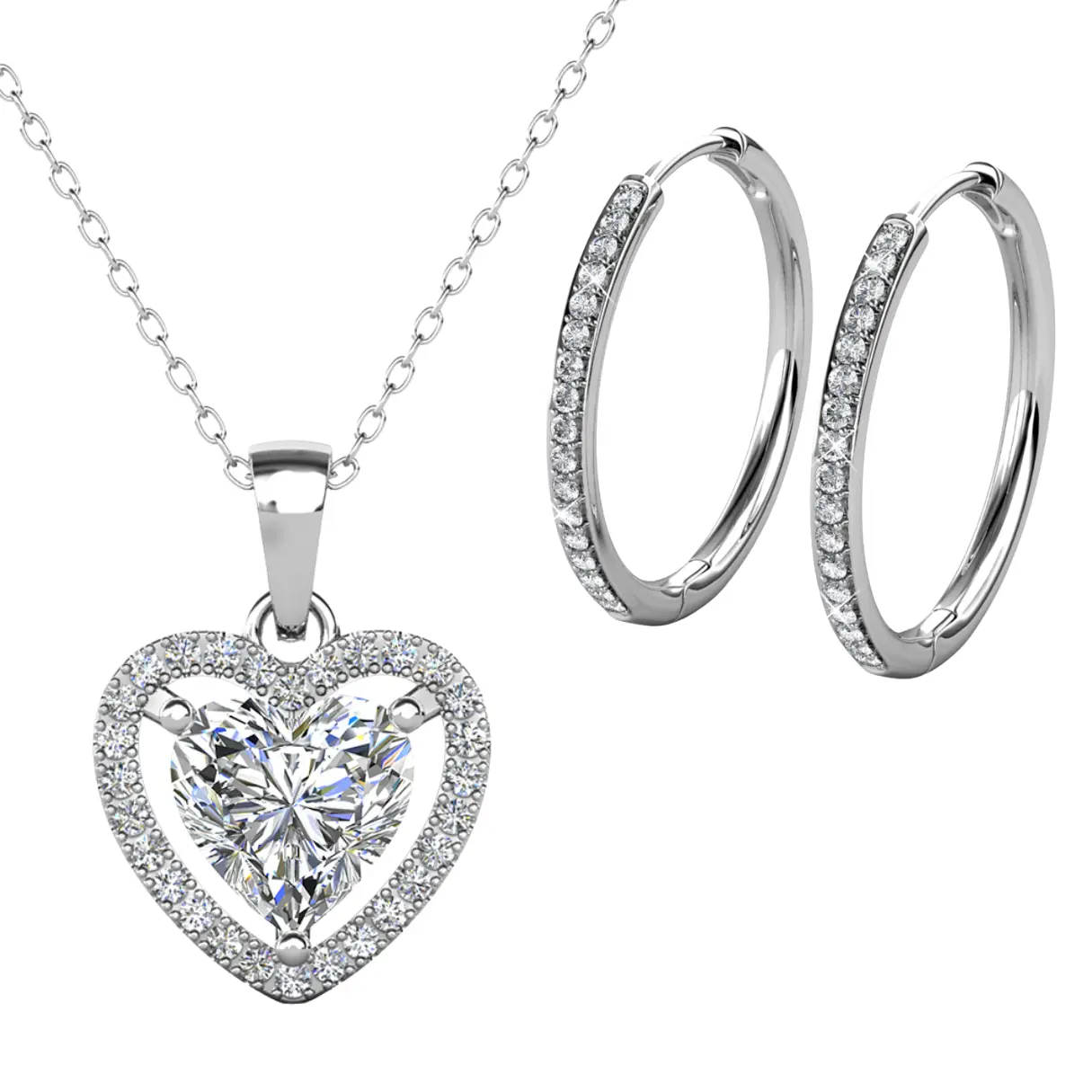 Elevate your everyday elegance or make a romantic statement with the Amora & Bianca Sparkle Set. This beautifully coordinated jewelry bundle includes two of our most loved pieces: the Amora Heart Halo Pendant Necklace and the Bianca Silver Hoop Earrings, both crafted with luxurious 18k white gold plating and adorned with dazzling simulated diamond crystals.