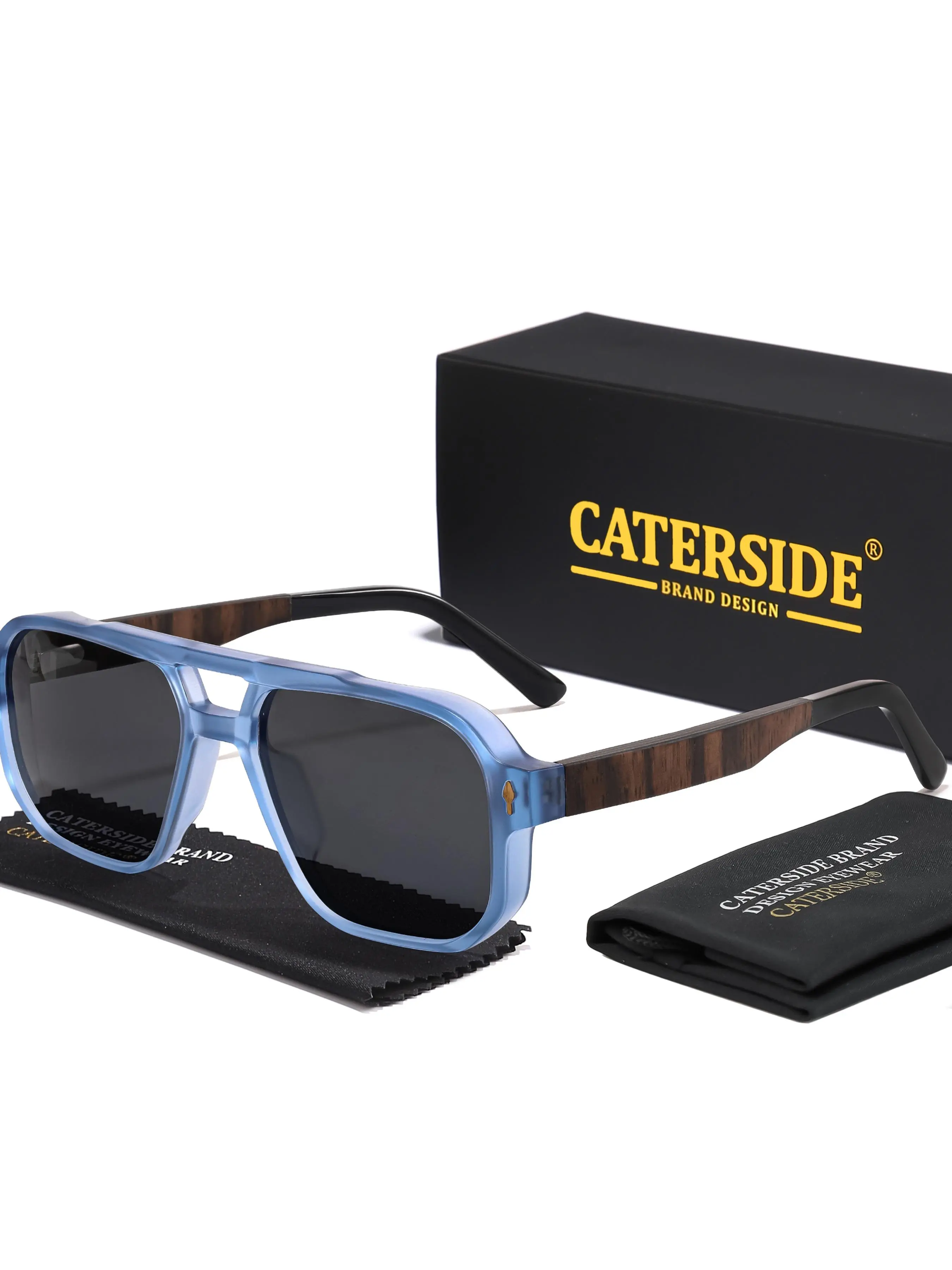 5. CATERSIDE 1 pair of packaged, non-clip-on spring hinge trendy casual sunglasses with solid wood temple and flat double bridge in 3 colors to choose from. Studio props/island vacation/city stroll/coffee shop check-in/Outdoor picnic