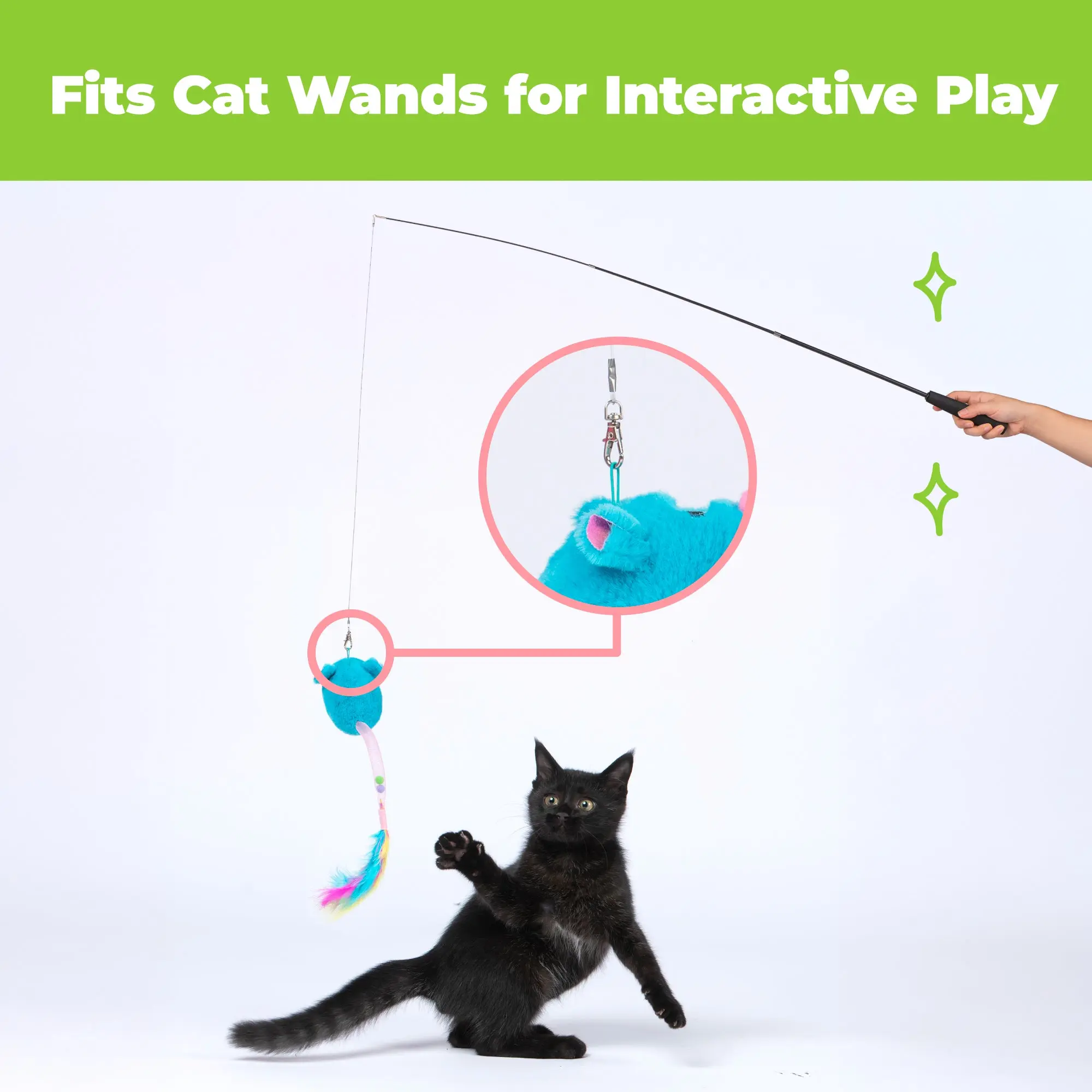 FUN DESIGNS: Available in Fluffy Fish, Sushi Rolls, Squeaking Mice, and Motion-Activated styles!