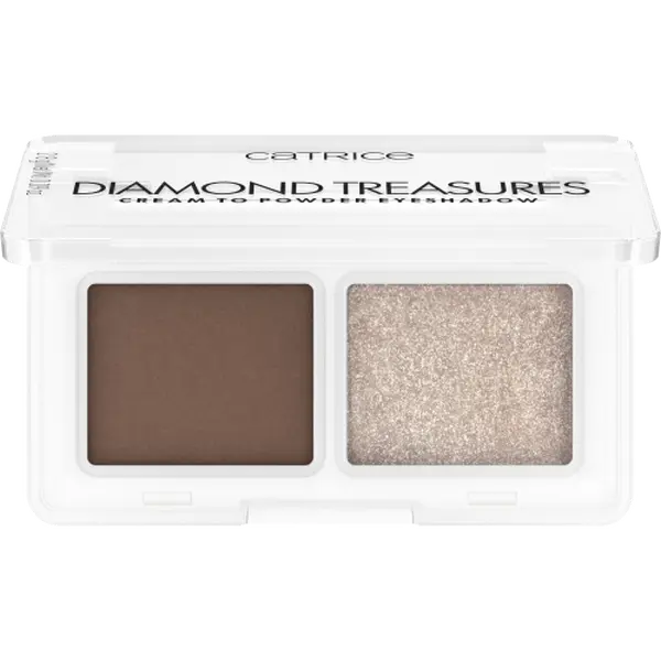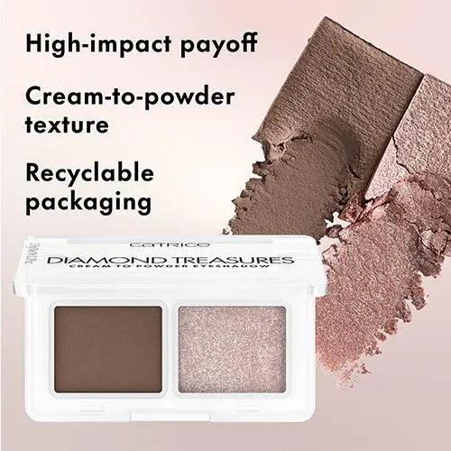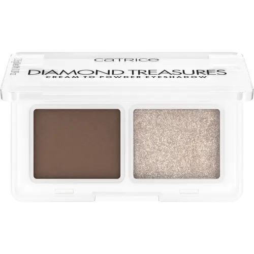 Meet the ultimate duo for flawless eye looks: the Catrice Diamond Treasures Cream to Powder Eyeshadow Duo. Featuring a unique dual-finish formula with a velvety matte base and a sparkling topper, this shadow lets you mix, match, and layer for customizable looks. The luxurious cream-to-powder texture glides on effortlessly, blending seamlessly for a weightless feel and long-lasting wear.Benefits: