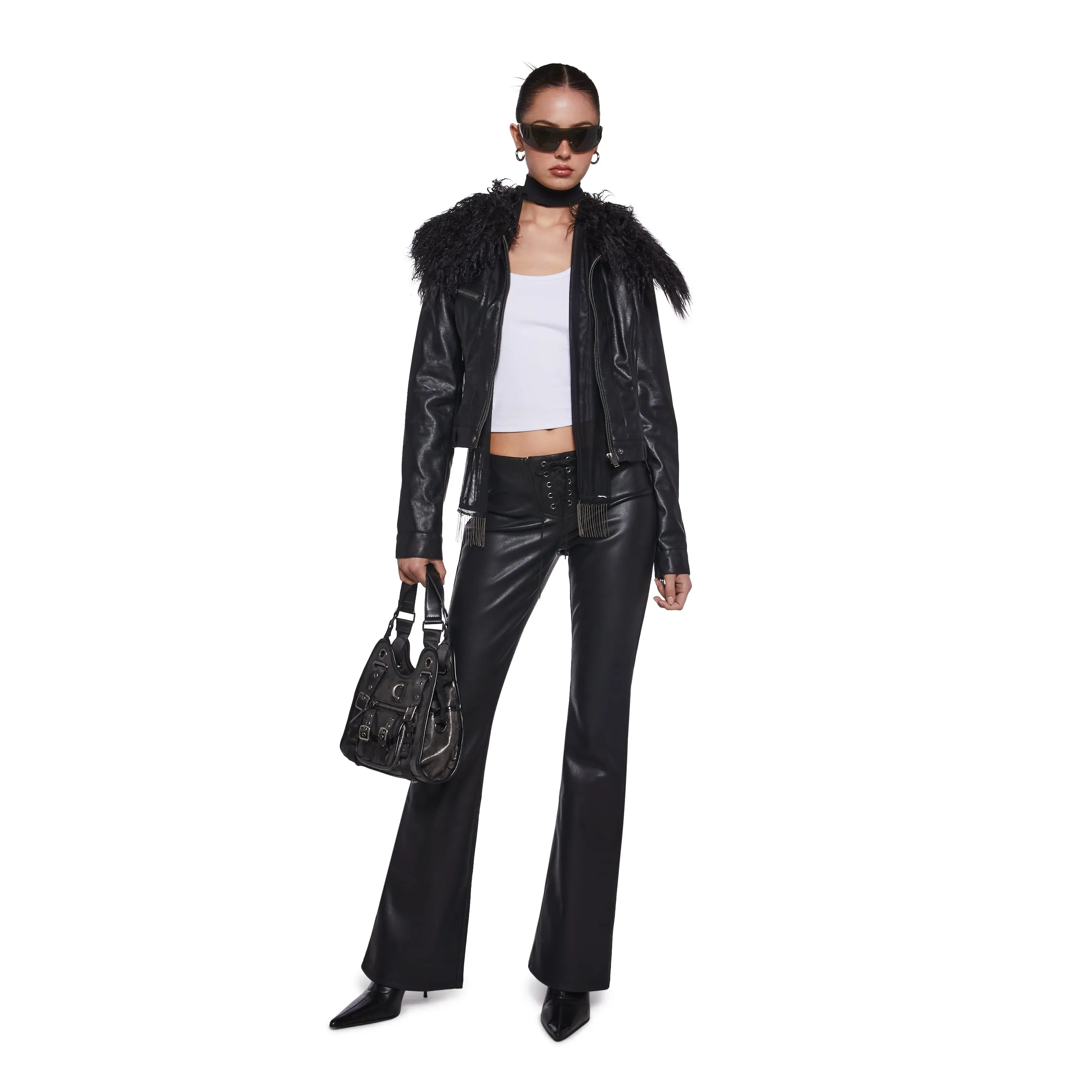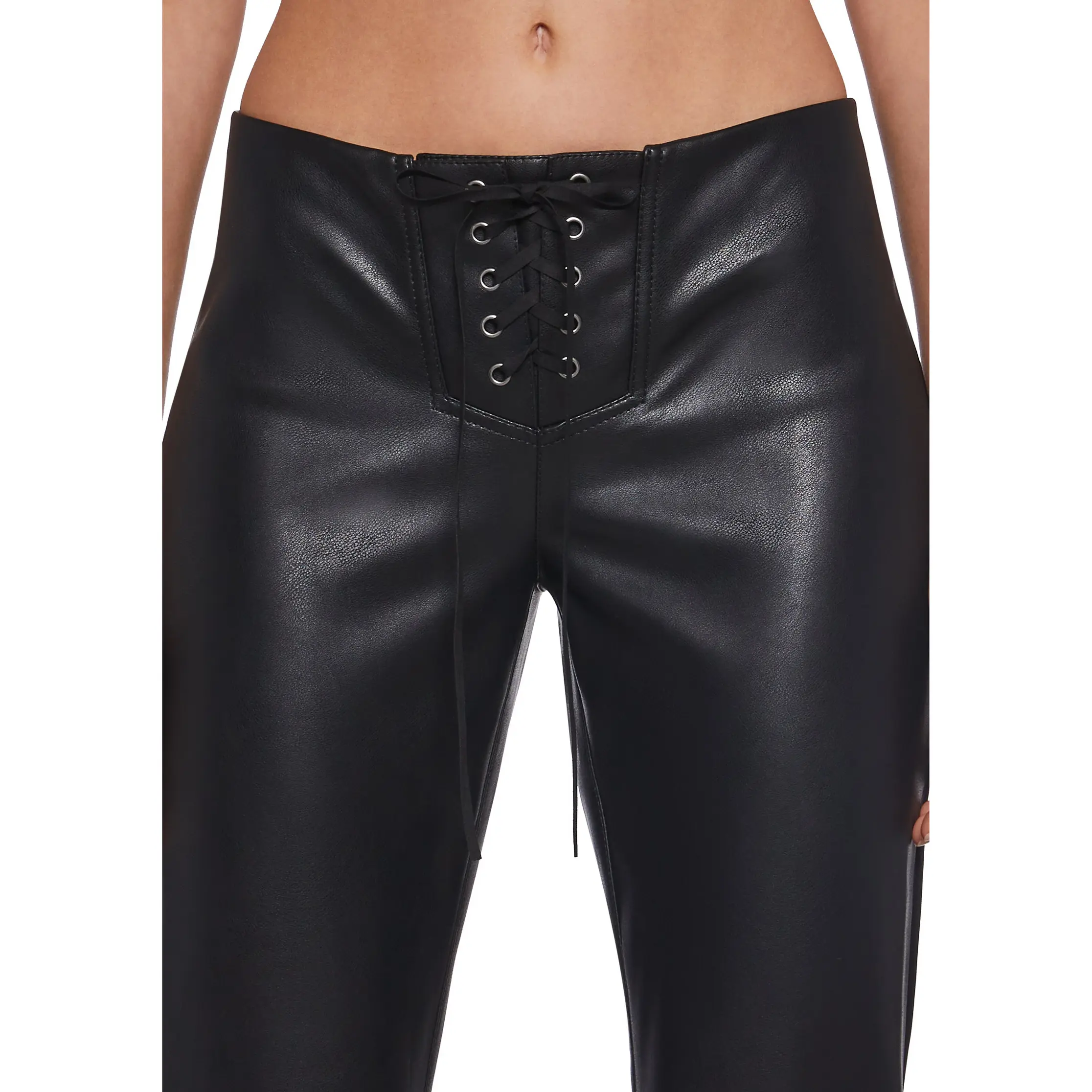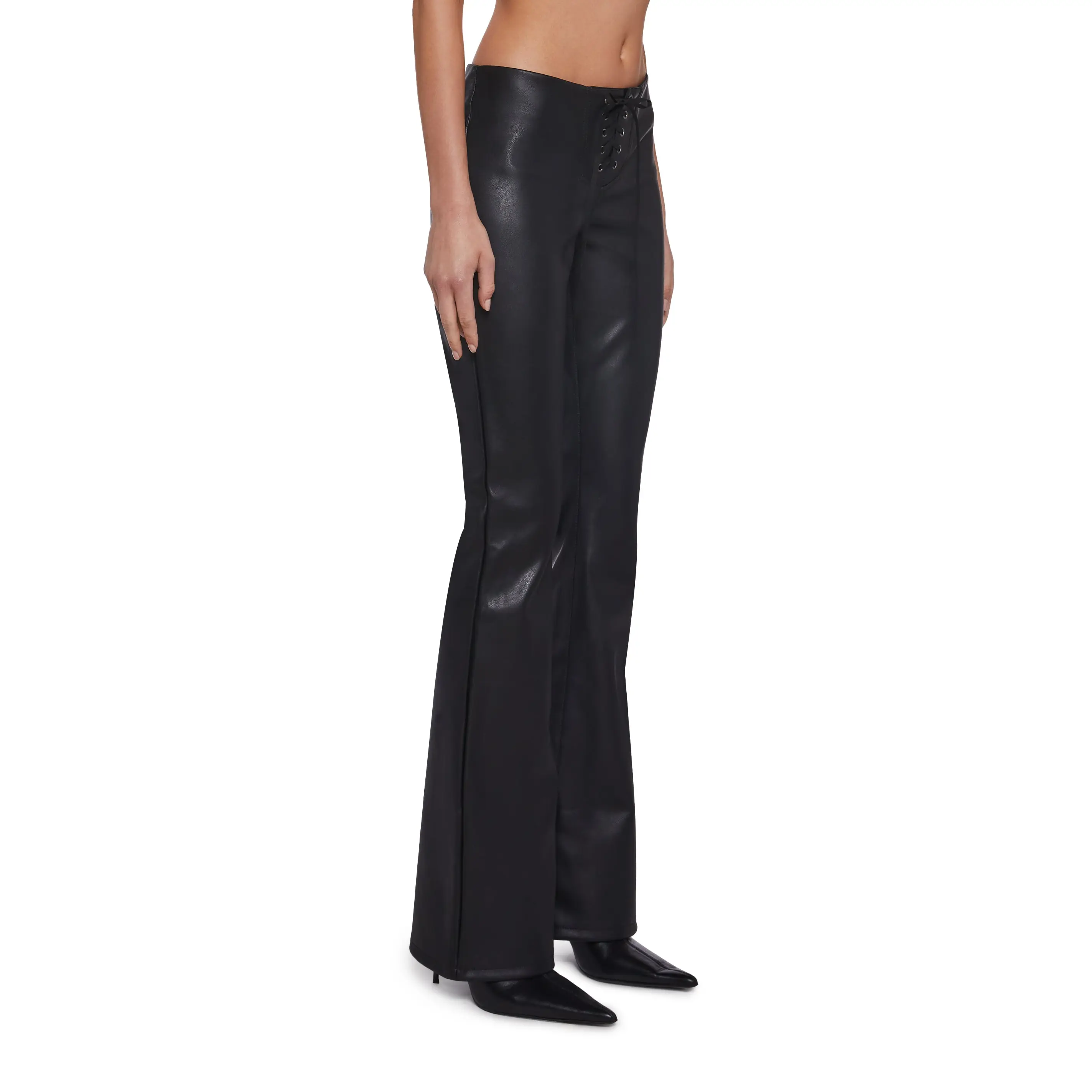 These pants have a vegan leather construction, a flared leg silhouette, and front lace-up closures.