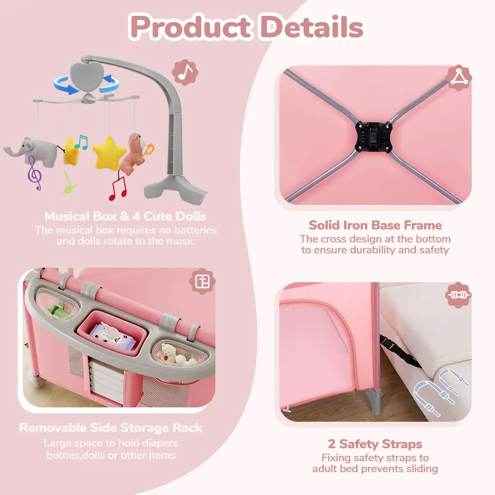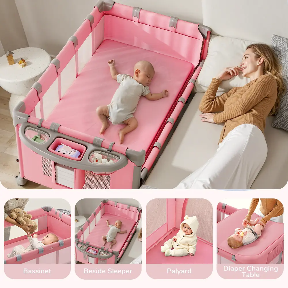 🌟 5-in-1 Multifunctional Design 🌟- Bedside Crib: Acts as a changing table, bassinet, bedside sleeper, baby playard, and activity center.- Comfort and Safety: Ensures your baby's comfort and safety in every moment.- Portable Changing Table: Makes diaper changes more comfortable and easier for new parents.- Safe Sleep and Play: Provides a safe place for your baby to sleep and play.