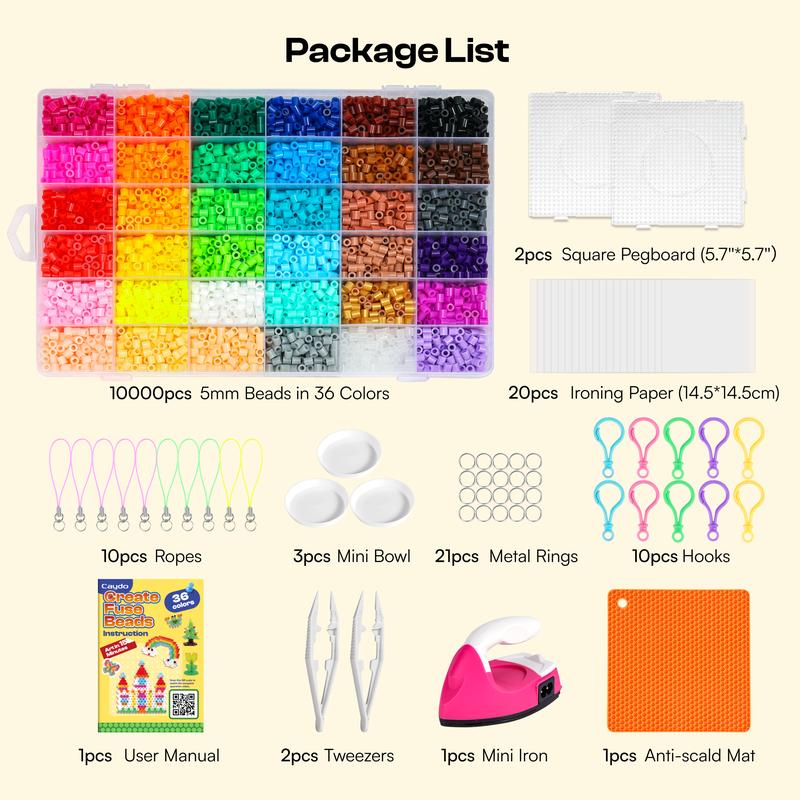 ·Complete 10,000pcs Starter Kit - Includes 5mm 36-color fuse beads (with storage container), corded mini iron, heat-resistant mat, 20 ironing papers, 2 pegboards, 10 hooks, 10 ropes, 2 tweezers and user manual – ready for immediate use