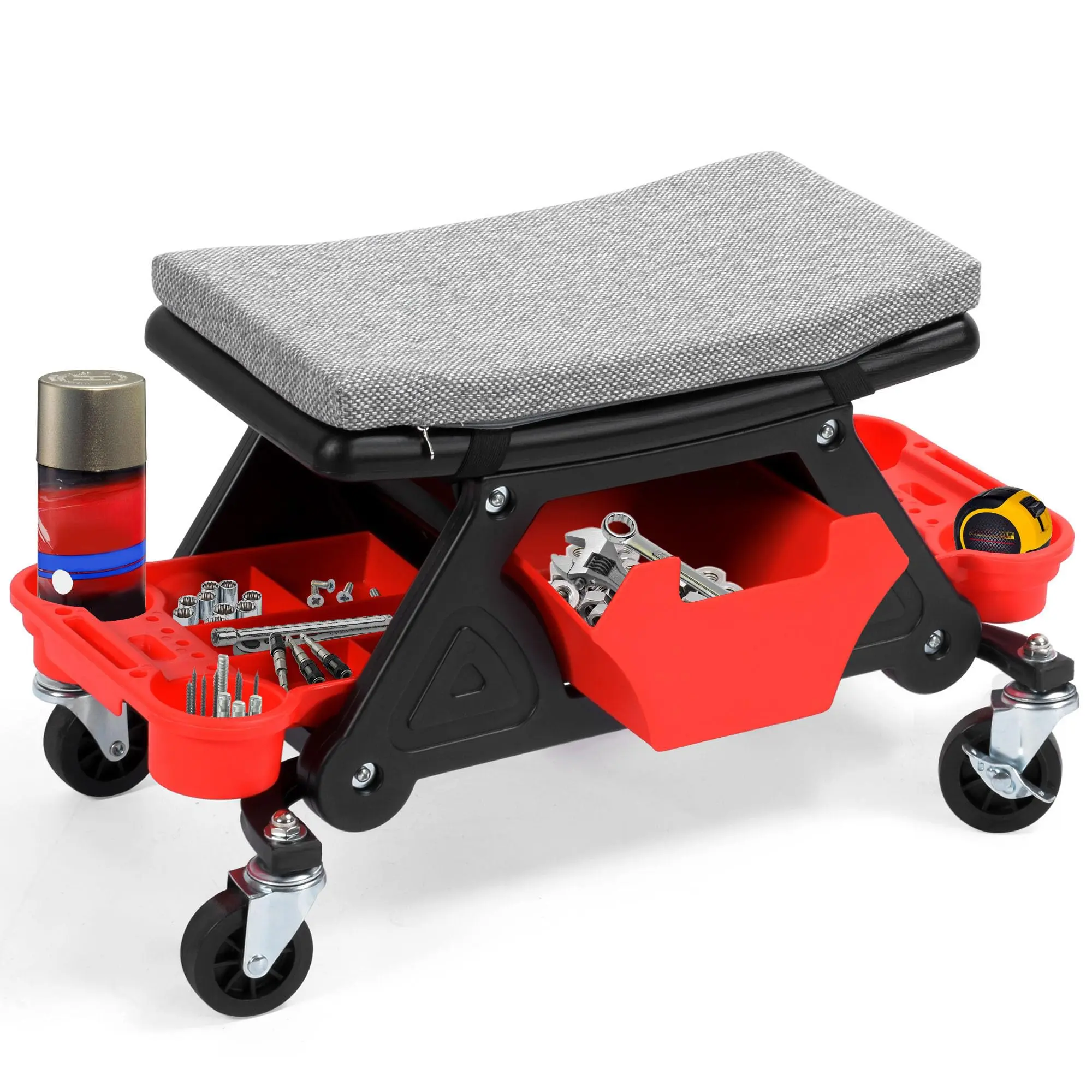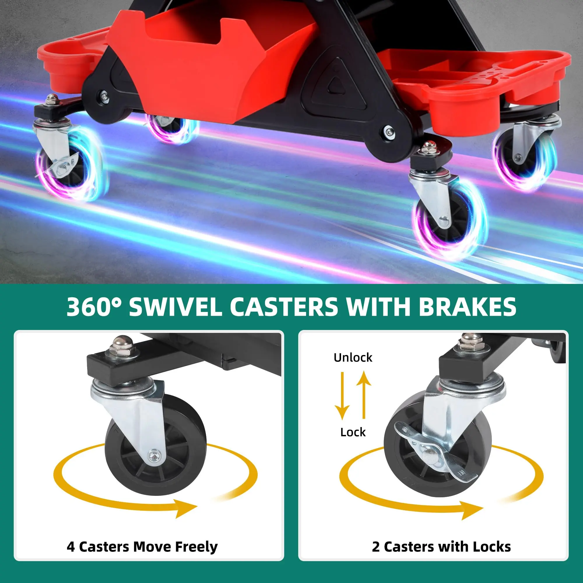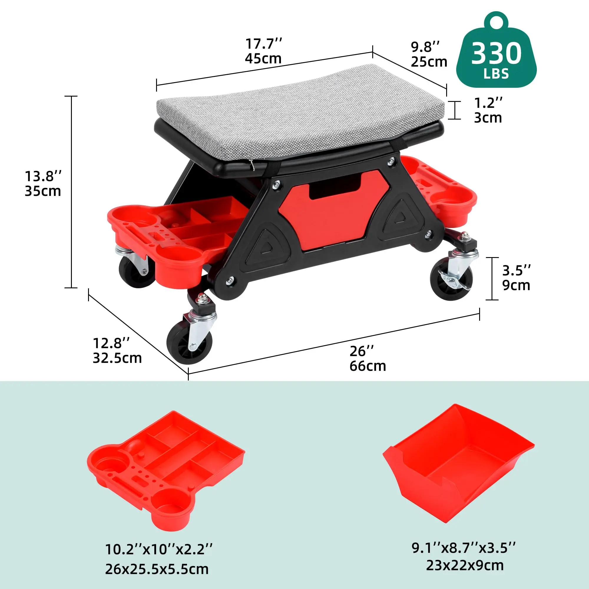 ·Ergonomic Stool: Our mechanic roller seat is built to help you work in comfort. The rolling stool features a generous seating area and has a non-slip surface. With a 330 lb loading capacity, everyone is welcome to sit down on the jobs, whether you're a mechanic or do auto detailing.