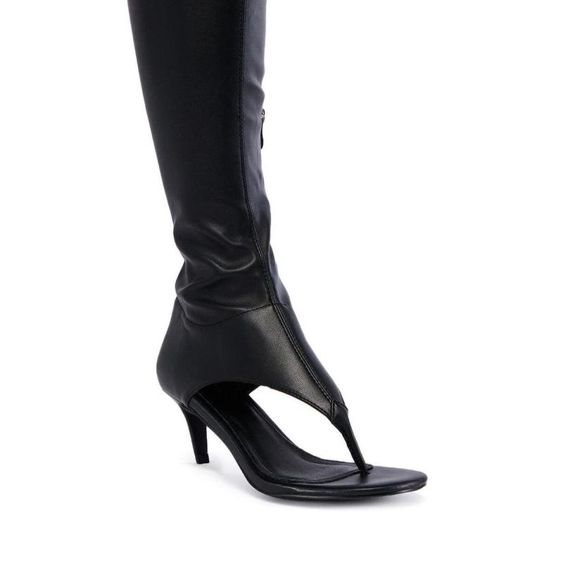 Deliver successful hybrid style in The AZALEA WANG Cecile Open Toe Sandal Boot in Black. This sleek faux leather pair features a below the knee shaft height, creating a chic and modern look. The open almond toe sandal silhouette with a thong toe design adds a touch of sophistication, while the cushioned insole ensures comfort throughout the day.