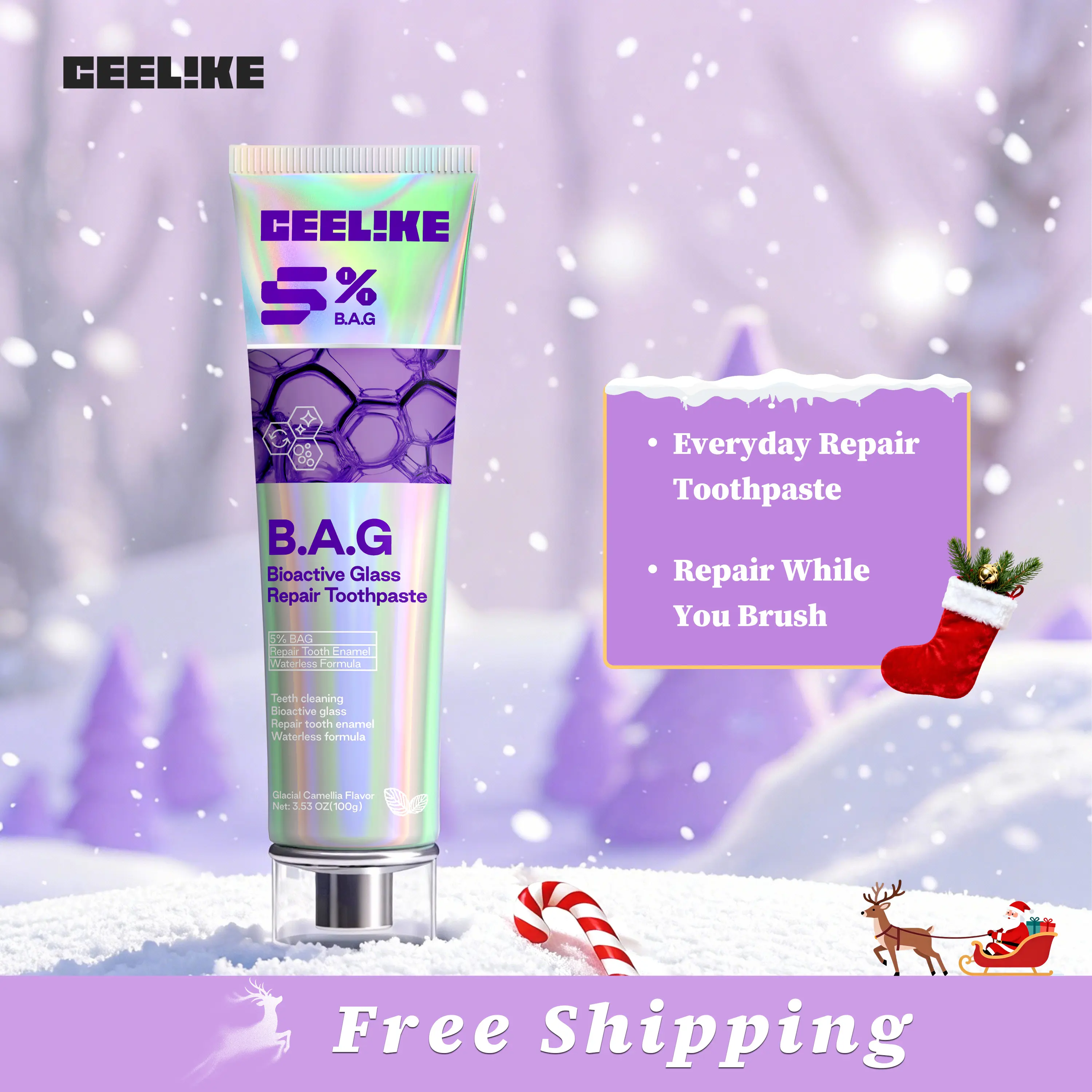 CEELIKE 5% B.A.G. Toothpaste harnesses bioactive glass technology for enamel repair. It offers comfort relief and restored breath freshness. This innovative formula is designed to address dental concerns effectively.